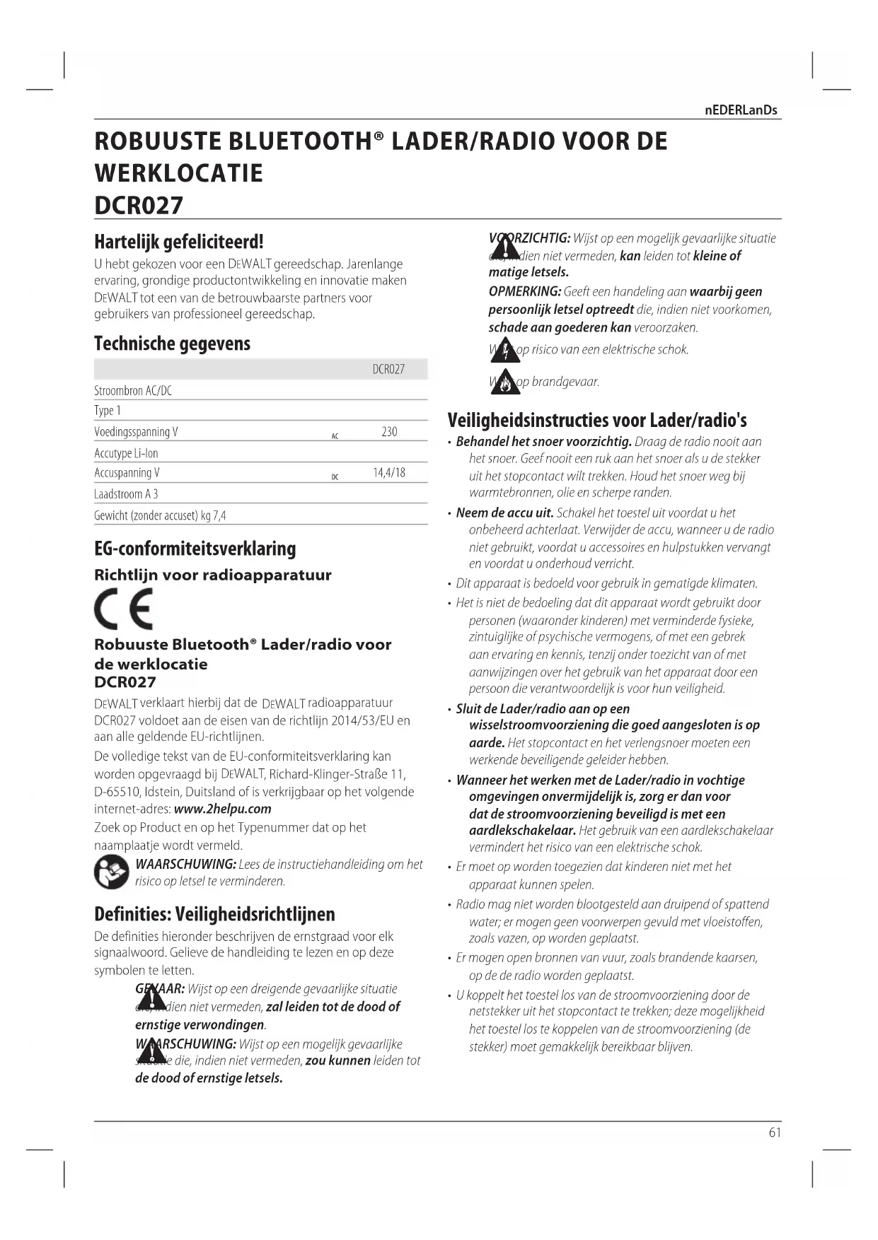 14,4/18 Laadstroom A 3 Gewicht (zonder accuset) kg 7,4 EG-conformiteitsverklaring Richtlijn voor radioapparatuur Robuuste Bluetooth® Lader/radio voor de werklocatie DCR027 DeWALT verklaart hierbij dat de DeWALT radioapparatuur DCR027 voldoet aan de eisen van de richtlijn 2014/53/EU en aan alle geldende EU-richtlijnen. De volledige tekst van de EU-conformiteitsverklaring kan worden opgevraagd bij DeWALT , Richard-Klinger-Straße 11, D-65510, Idstein, Duitsland of is verkrijgbaar op het volgende internet-adres: www.2helpu.com Zoek op Product en op het Typenummer dat op het naamplaatje wordt vermeld. WAARSCHUWING: Lees de instructiehandleiding om het risico op letsel teverminderen. Definities: Veiligheidsrichtlijnen De definities hieronder beschrijven de ernstgraad voor elk signaalwoord. Gelieve de handleiding te lezen en op deze symbolen teletten.
