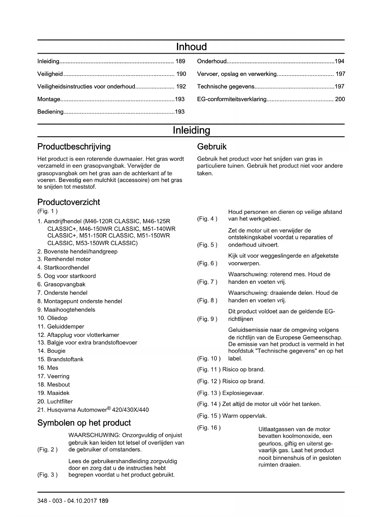 420/430X/440 Symbolen op het product (Fig. 2 ) WAARSCHUWING: Onzorgvuldig of onjuist gebruik kan leiden tot letsel of overlijden van de gebruiker of omstanders. (Fig. 3 ) Lees de gebruikershandleiding zorgvuldig door en zorg dat u de instructies hebt begrepen voordat u het product gebruikt. (Fig. 4 ) Houd personen en dieren op veilige afstand van het werkgebied. (Fig. 5 ) Zet de motor uit en verwijder de ontstekingskabel voordat u reparaties of onderhoud uitvoert. (Fig. 6 ) Kijk uit voor weggeslingerde en afgeketste voorwerpen. (Fig. 7 ) Waarschuwing: roterend mes. Houd de handen en voeten vrij. (Fig. 8 ) Waarschuwing: draaiende delen. Houd de handen en voeten vrij. (Fig. 9 ) Dit product voldoet aan de geldende EG- richtlijnen (Fig. 10 ) Geluidsemissie naar de omgeving volgens de richtlijn van de Europese Gemeenschap. De emissie van het product is vermeld in het hoofdstuk "Technische gegevens" en op het label. (Fig. 11 ) Risico op brand. (Fig. 12 ) Risico op brand. (Fig. 13 ) Explosiegevaar. (Fig. 14 ) Zet altijd de motor uit vóór het tanken. (Fig. 15 ) Warm oppervlak. (Fig. 16 ) Uitlaatgassen van de motor bevatten koolmonoxide, een geurloos, giftig en uiterst ge- vaarlijk gas. Laat het product nooit binnenshuis of in gesloten ruimten draaien.