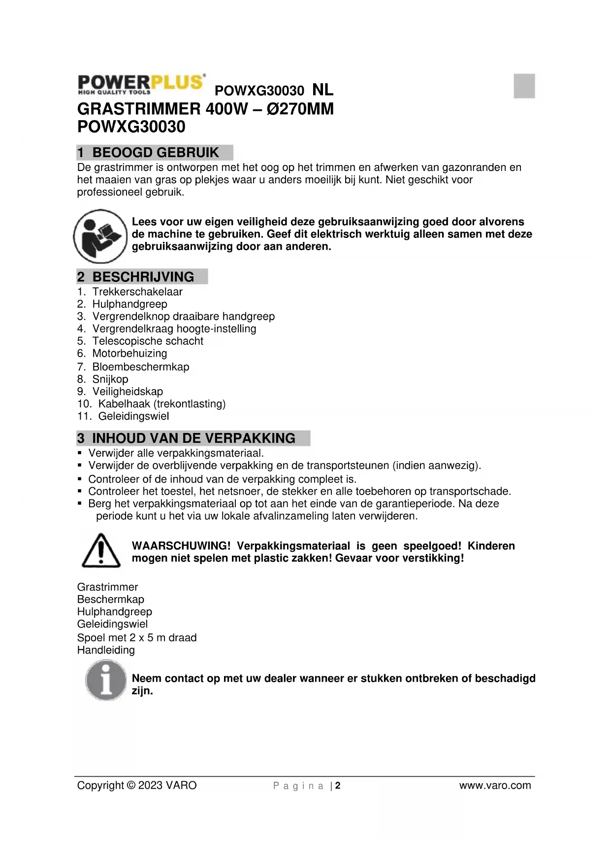 - Berg het verpakkingsmateriaal op tot aan het einde van de garantieperiode. Na deze periode kunt u het via uw lokale afvalinzameling laten verwijderen. WAARSCHUWING! Verpakkingsmateriaal is geen speelgoed! Kinderen mogen niet spelen met plastic zakken! Gevaar voor verstikking! Grastrimmer Beschermkap Hulphandgreep Geleidingswiel Spoel met 2 x 5 m draad Handleiding Neem contact op met uw dealer wanneer er stukken ontbreken of beschadigd zijn.POWXG30030 NL Copyright © 2023 VARO P a g i n a | 3 www.varo.com