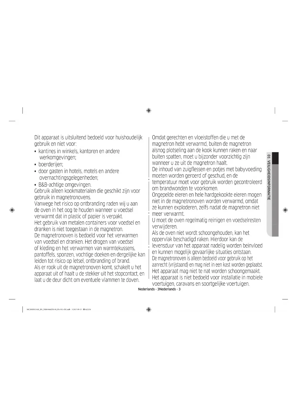 - Technische specicaties MC28H5013AK_EN_DE68-04425B-00_FR+NL+DE.indb 2 2017-09-15 4:22:54Nederlands - 3Nederlands - 3 01 VEILIGHEIDSINFORMATIE Dit apparaat is uitsluitend bedoeld voor huishoudelijk gebruik en niet voor: p. 43
