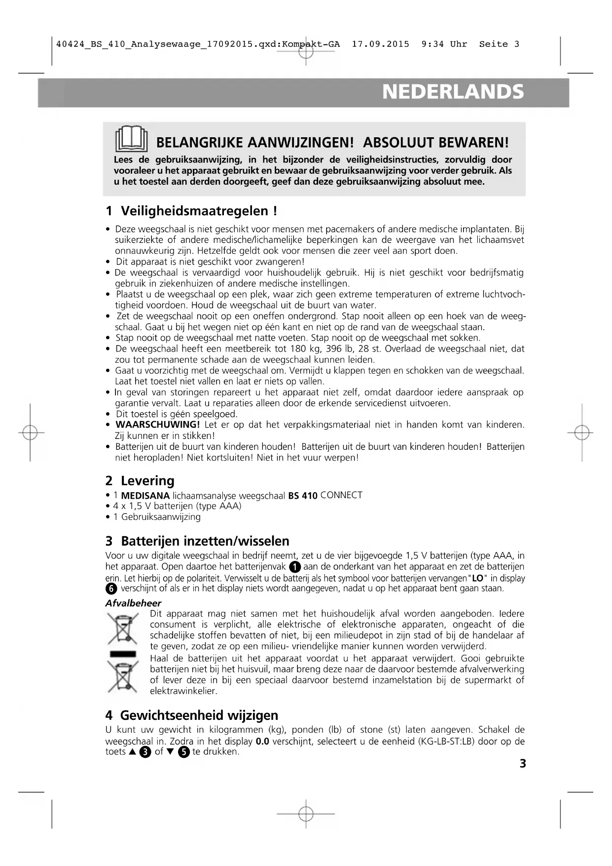 te drukken. BELANGRIJKE AANWIJZINGEN! ABSOLUUT BEWAREN! Lees de gebruiksaanwijzing, in het bijzonder de veiligheidsinstructies, zorvuldig door vooraleer u het apparaat gebruikt en bewaar de gebruiksaanwijzing voor verder gebruik. Als u het toestel aan derden doorgeeft, geef dan deze gebruiksaanwijzing absoluut mee. Afvalbeheer Dit apparaat mag niet samen met het huishoudelijk afval worden aangeboden. Iedere consument is verplicht, alle elektrische of elektronische apparaten, ongeacht of die schadelijke stoffen bevatten of niet, bij een milieudepot in zijn stad of bij de handelaar af te geven, zodat ze op een milieu- vriendelijke manier kunnen worden verwijderd. Haal de batterijen uit het apparaat voordat u het apparaat verwijdert. Gooi gebruikte batterijen niet bij het huisvuil, maar breng deze naar de daarvoor bestemde afvalverwerking of lever deze in bij een speciaal daarvoor bestemd inzamelstation bij de supermarkt of elektrawinkelier. 40424_BS_410_Analysewaage_17092015.qxd:Kompakt-GA 17.09.2015 9:34 Uhr Seite 34 NEDERLANDS 5 Wegen “step-on”-functie