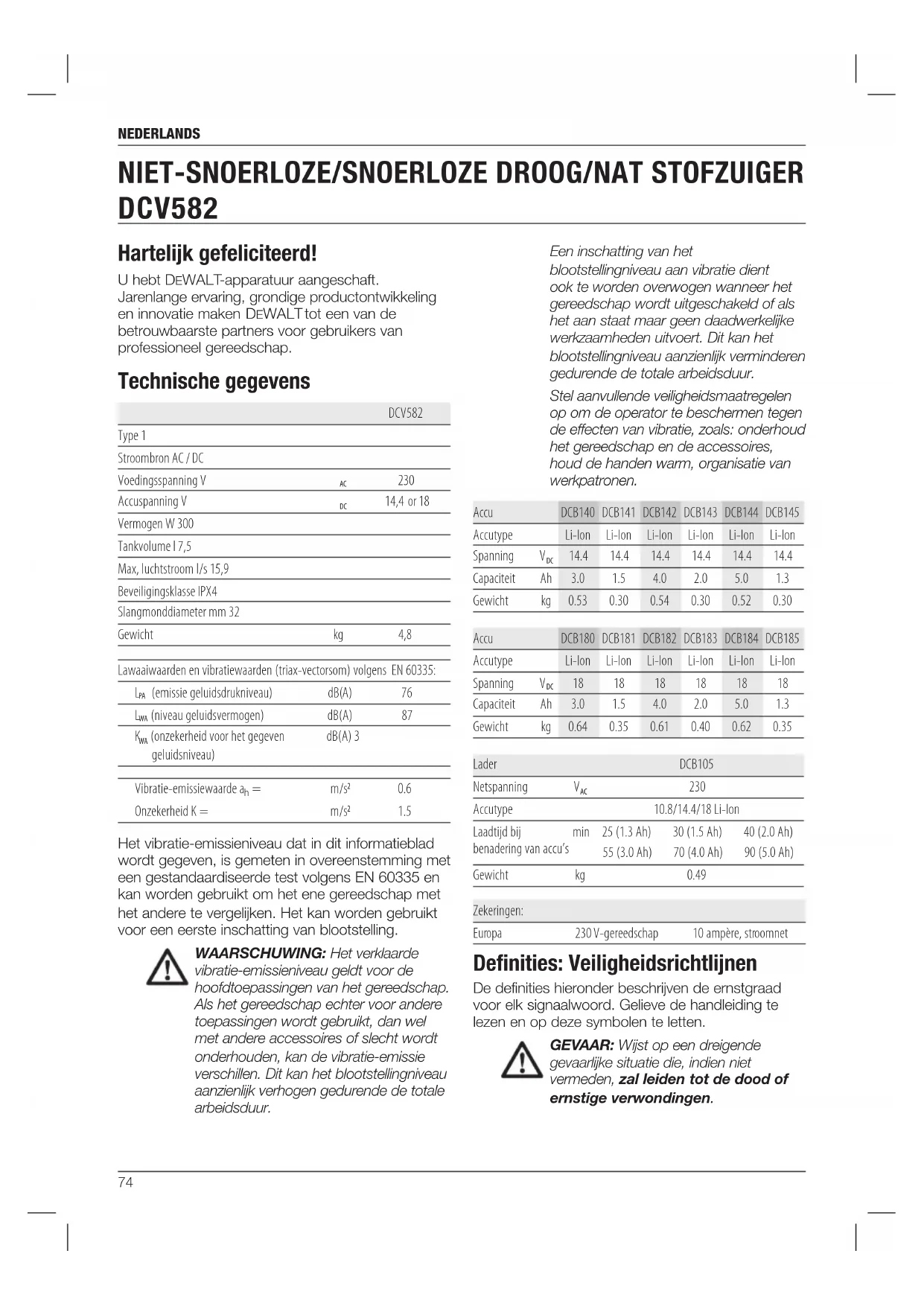 - Le celle Li-Ion sono riciclabili. Consegnarle al rivenditore o ad un servizio di riciclaggio di zona. I pacchi batteria raccolti verranno riciclati o smaltiti in modo corretto.74 neDerlanDs Hartelijk gefeliciteerd! U hebt DeWALT -apparatuur aangeschaft. Jarenlange ervaring, grondige productontwikkeling en innovatie maken DeWALT tot een van de betrouwbaarste partners voor gebruikers van professioneel gereedschap. Technische gegevens DCV582 Type 1 Stroombron AC / DC Voedingsspanning V