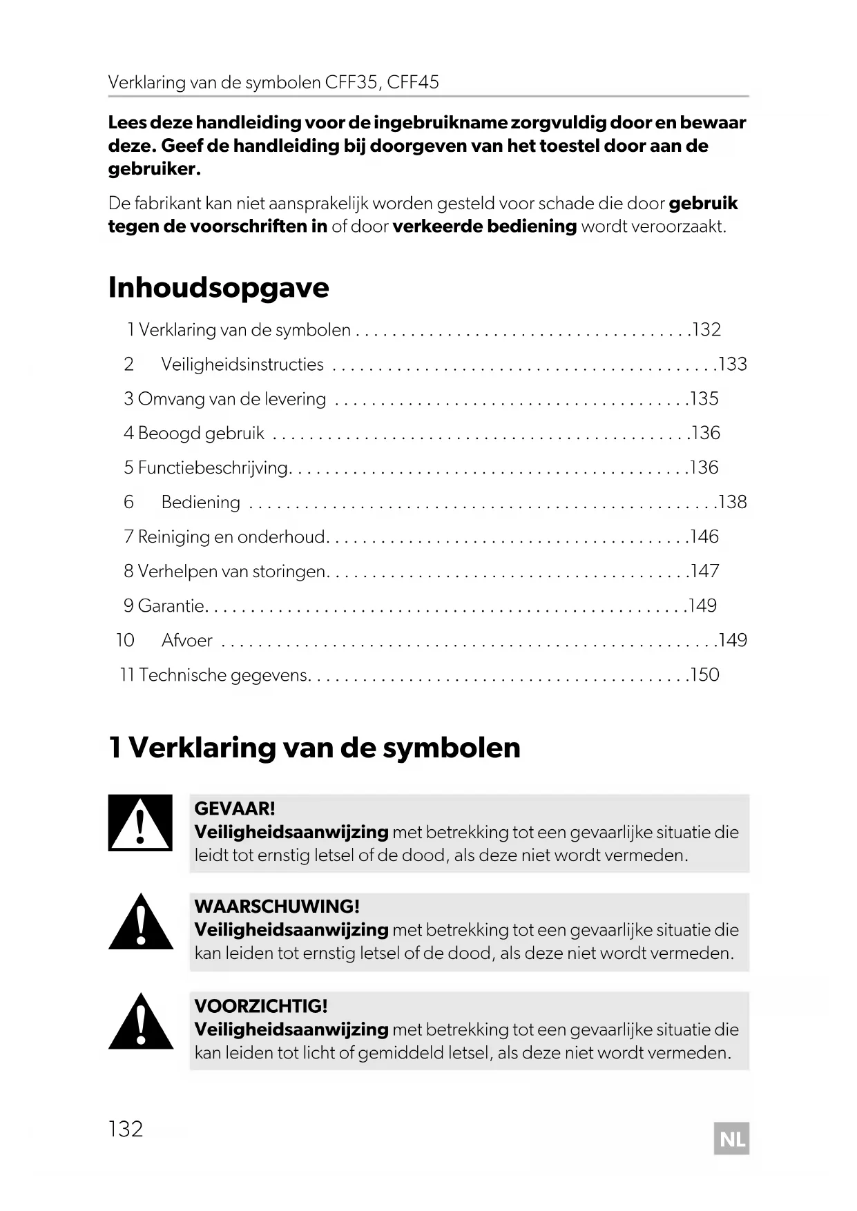 - Lees deze handleiding voor de ingebruikname zorgvuldig door en bewaar deze. Geef de handleiding bij doorgeven van het toestel door aan de gebruiker. De fabrikant kan niet aansprakelijk worden gesteld voor schade die door gebruik tegen de voorschriften in of door verkeerde bediening wordt veroorzaakt. Inhoudsopgave 1 Verklaring van de symbolen p. 132
