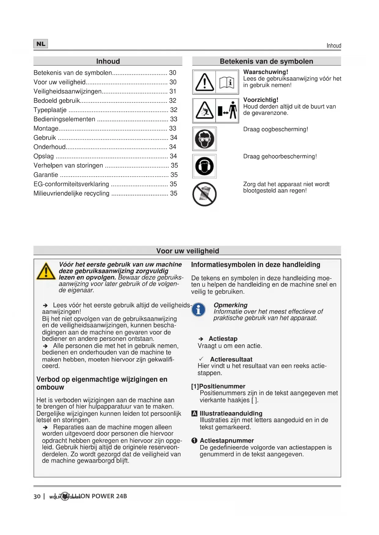 - Milieuvriendelijke recycling Voor uw veiligheid Betekenis van de symbolen Waarschuwing! Lees de gebruiksaanwijzing vóór het in gebruik nemen! Voorzichtig! Houd derden altijd uit de buurt van de gevarenzone. Draag oogbescherming! Draag gehoorbescherming! Zorg dat het apparaat niet wordt blootgesteld aan regen!Veiligheidsaanwijzingen p. 35
