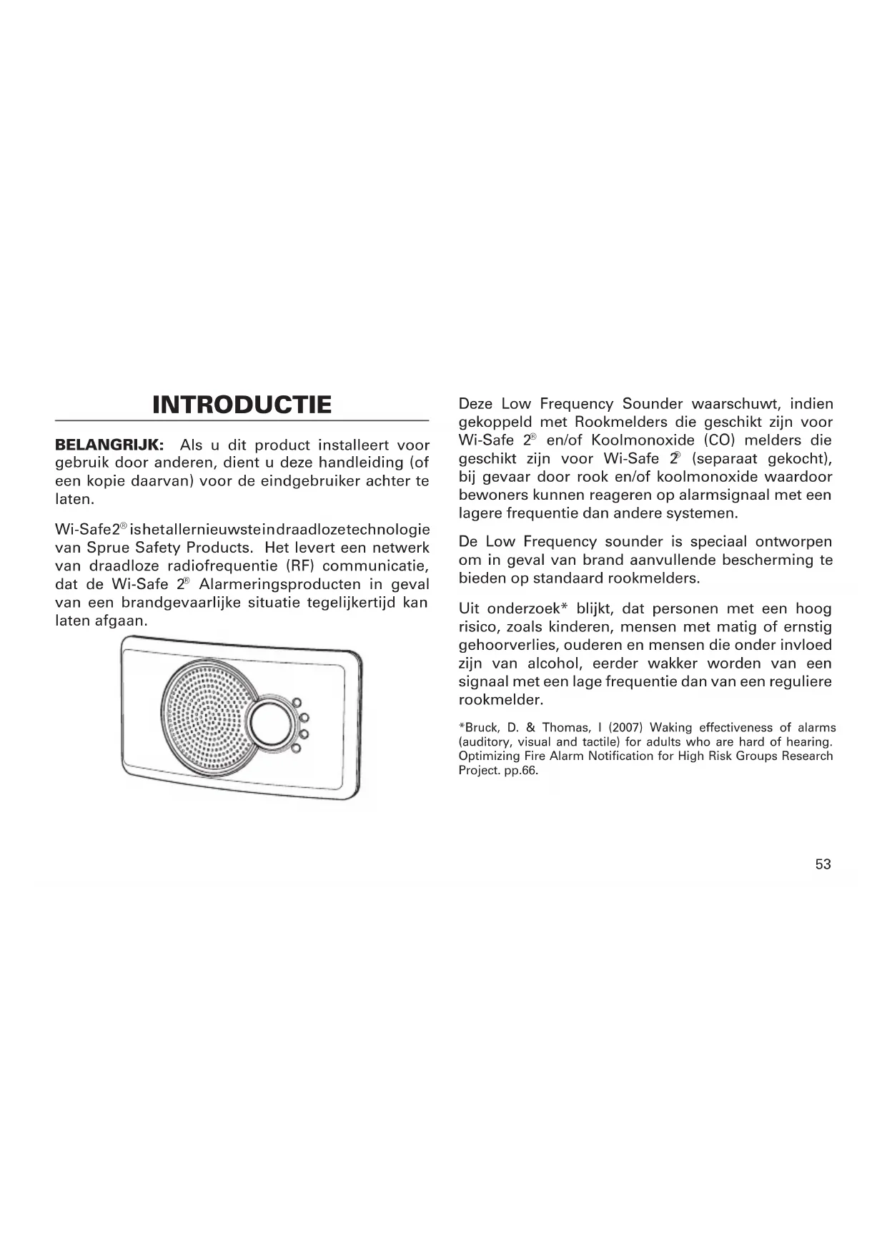 (separaat gekocht), bij gevaar door rook en/of koolmonoxide waardoor bewoners kunnen reageren op alarmsignaal met een lagere frequentie dan andere systemen. De Low Frequency sounder is speciaal ontworpen om in geval van brand aanvullende bescherming te bieden op standaard rookmelders. Uit onderzoek* blijkt, dat personen met een hoog risico, zoals kinderen, mensen met matig of ernstig gehoorverlies, ouderen en mensen die onder invloed zijn van alcohol, eerder wakker worden van een signaal met een lage frequentie dan van een reguliere rookmelder. *Bruck, D. & Thomas, I (2007) Waking effectiveness of alarms (auditory, visual and tactile) for adults who are hard of hearing. Optimizing Fire Alarm Notification for High Risk Groups Research Project. pp.66.54 BIJZONDERE KENMERKEN