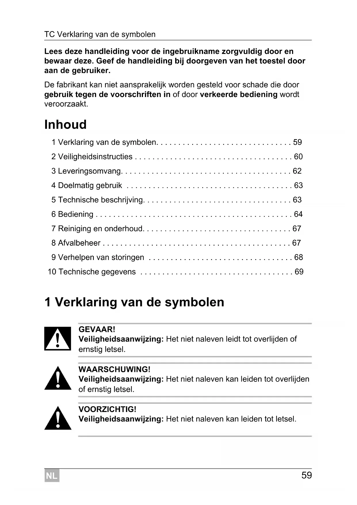- Lees deze handleiding voor de ingebruikname zorgvuldig door en bewaar deze. Geef de handleiding bij doorgeven van het toestel door aan de gebruiker. De fabrikant kan niet aansprakelijk worden gesteld voor schade die door gebruik tegen de voorschriften in of door verkeerde bediening wordt veroorzaakt. Inhoud 1 Verklaring van de symbolen p. 59