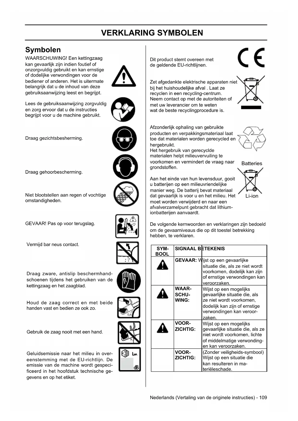 - Elke kettingzaag is mogelijk dodelijk indien het oneigenlijk wordt gebruikt. Het is ten zeerste aangewezen om een professionele opleiding te vol- gen inzake veiligheid en gebruik van dit werktuig.