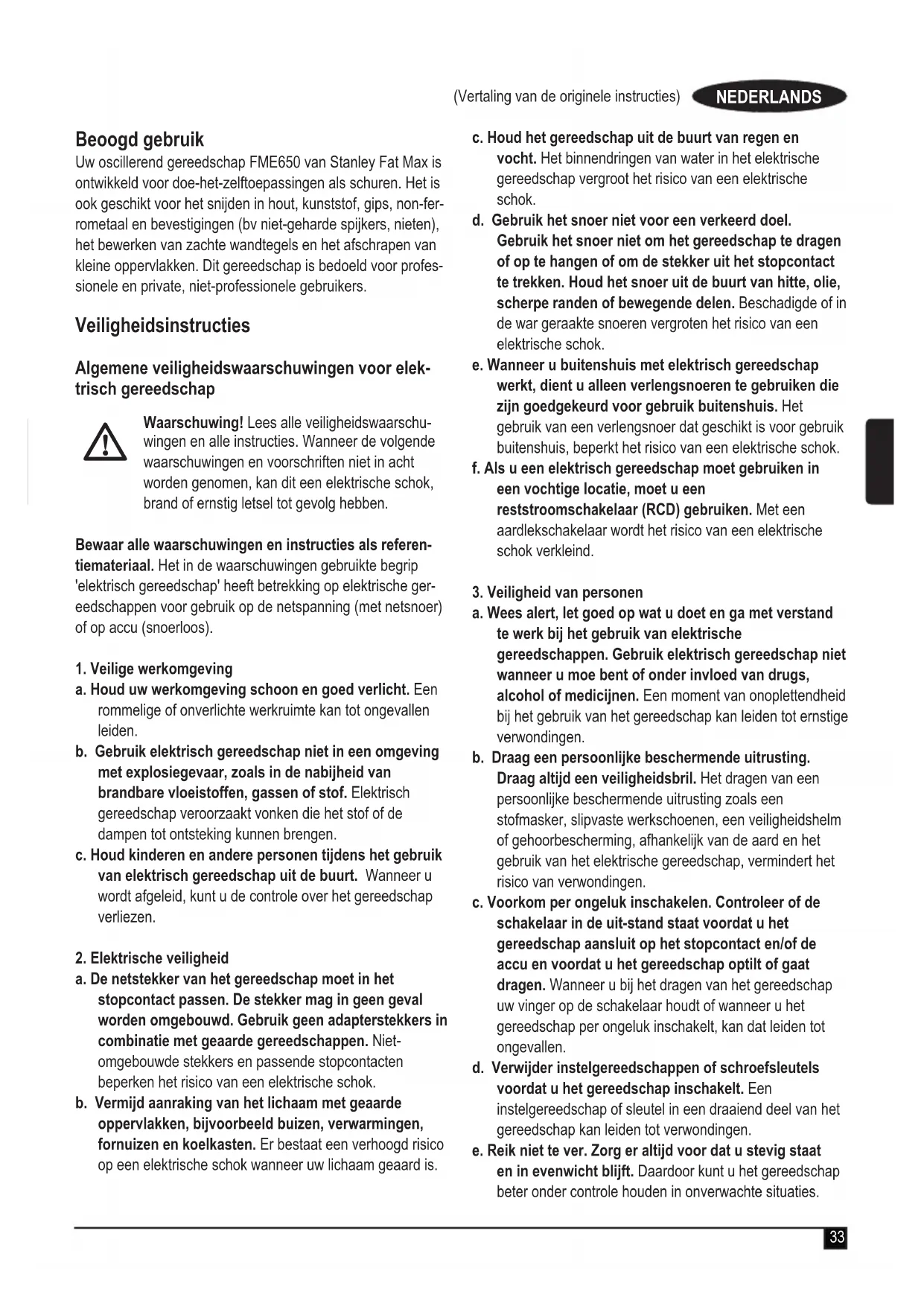 klemhendel voor accessoires, waarbij geen gereedschap nodig is. Gebruik Waarschuwing! Laat het gereedschap in zijn eigen tempo werken. Niet overbelasten. Waarschuwing! Controleer waar zich bedrading en leidingen bevinden voordat u in muren, vloeren of plafonds gaat zagen. Snelheidsregelaar (g. H) Met de snelheidsregelaar kunt u de snelheid van het gereed- schap aanpassen aan de toepassing. u Zet de knop voor variabele snelheid (2) op de gewenste instelling. Bij instelling 1 werkt het gereedschap op lage snelheid, 10,000 min-1. Bij instelling 6 werkt het gereedsc- hap op de maximumsnelheid, 22,000 min-1. In- en uitschakelen (afb. I) u Schuif de aan/uit-schakelaar (1) vooruit naar stand I om het gereedschap in te schakelen. u Schuif de aan/uit-schakelaar (1) achteruit naar positie O om het apparaat uit te schakelen. Zaaggeleider (g. F en J) Hiermee kunt u een gemarkeerde zaaglijn nauwkeuriger volgen. u Als u de zaaggeleider wilt gebruiken, plaatst u de geleider (13) in de voorste sleuf op het blok met de diepte-/zaagge- leider (8), zoals weergegeven in guur J. u Pas de lengte van de geleider aan door deze uit te trekken of in te duwen tot u de gewenste zaagdiepte hebt bereikt. u Vergrendel de geleider in de positie door de instelknop voor diepte/zagen (12) rechtsom te draaien. Draai de instelknop voor diepte/zagen linksom om de geleider te ontgrendelen.38 (Vertaling van de originele instructies) NEDERLANDS Dieptegeleider (g. F en K) Hiermee kunt u materiaal nauwkeurig zagen op een ingestelde diepte. u Als u de dieptegeleider wilt gebruiken, plaatst u de gelei- der (13) in de voorste sleuf op het blok met de diepte-/ zaaggeleider (8), zoals weergegeven in guur K. u Pas de lengte van de geleider aan door deze uit te trekken of in te duwen tot u de gewenste zaagdiepte hebt bereikt. u Vergrendel de geleider in de positie door de instelknop voor diepte/zagen (12) rechtsom te draaien. Draai de instelknop voor diepte/zagen linksom om de geleider te ontgrendelen. Tips voor optimaal gebruik u Houd het gereedschap altijd stevig vast. Voor precisiewerk houdt u het gereedschap verder naar voren vast. u Klem het werkstuk wanneer mogelijk vast, vooral wanneer u snijbladen gebruikt. u Voer niet te veel druk op de machine uit. u Gebruik altijd het juiste type hulpstuk voor het werkstuk- materiaal en het type zaagsnede. u Controleer regelmatig de staat van de accessoires. Vervang deze indien nodig. u Markeer het gewenste startpunt. u Schakel het gereedschap in en breng de hulpstukken langzaam in contact met het werkstuk, op het gewenste startpunt. u Klem een stuk multiplex of zacht houd vast aan de achterzijde van het werkstuk en zaag door de combinatie om een scherpe snede te krijgen. u Forceer het snijvlak niet in het werkstuk. Let erop dat het snijden van metaalplaat normaal gesproken meer tijd kost dan het zagen van dikkere werkstukken van hout. u Wanneer u metaal snijdt, moet u een dunne laag olie over de snijlijn verspreiden voordat u snijdt. u Gebruik een extra jne korrel bij het schuren van een nieuwe veraag voordat een volgende veraag wordt aangebracht. u Begin op zeer oneffen oppervlakken of bij het verwijderen van veragen met een grove korrel. Begin op andere oppervlakken met een mediumkorrel. Ga in beide gevallen geleidelijk aan over op een jne korrel voor een gladde afwerking. u Informeer bij uw detailhandel voor meer informatie over de verkrijgbare accessoires. Onderhoud Uw Stanley Fat Max-gereedschap/-apparaat (met nets- noer/snoerloos) is ontworpen om gedurende langere tijd te functioneren met een minimum aan onderhoud. U kunt het gereedschap naar volle tevredenheid blijven gebruiken als u voor correct onderhoud zorgt en het gereedschap regelmatig schoonmaakt. Waarschuwing! Doe altijd het volgende voordat u onder- houds- of reinigingswerkzaamheden aan het gereedschap (met snoer/snoerloos) uitvoert. u Schakel het gereedschap/apparaat uit en trek de stekker uit het stopcontact. u Als het gereedschap/apparaat een afzonderlijke accu heeft, schakelt u het gereedschap/apparaat uit en haalt u de accu eruit. u Als de accu is ingebouwd, laat u deze volledig ontladen. Schakel dan het apparaat uit. u Reinig regelmatig de ventilatieopeningen van het gereed- schap/apparaat/lader met een zachte borstel of droge doek. u Reinig de behuizing van de motor regelmatig met een vochtige doek. Gebruik geen schuur- of oplosmiddel. Netstekker vervangen (alleen Verenigd Koninkrijk en Ierland) Als er een nieuwe netstekker moet worden aangebracht: u Gooi de oude stekker op verantwoorde wijze weg. u Verbind de bruine draad met de spannings-/fasepool in de nieuwe stekker. u Verbind de blauwe draad met de nul-/neutraalpool. Waarschuwing! De aardepool hoeft niet te worden aanges- loten. Volg de bevestigingsinstructies die met hoogwaardige stekkers worden meegeleverd. Aanbevolen zekering: 5 A. Milieu
