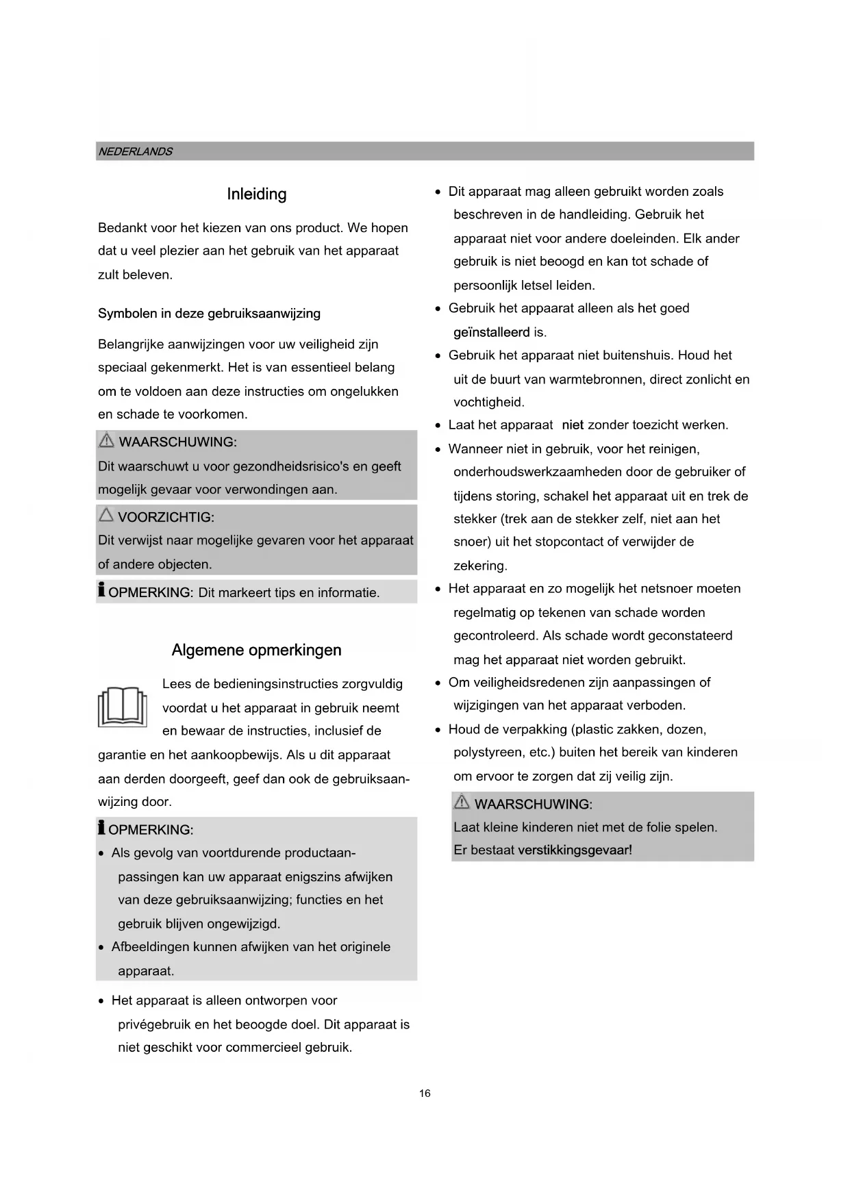 NEDERLANDS Inleiding Bedankt voor het kiezen van ons product. We hopen dat u veel plezier aan het gebruik van het apparaat zult beleven. Symbolen in deze gebruiksaanwijzing Belangrijke aanwijzingen voor uw veiligheid zijn speciaal gekenmerkt. Het is van essentieel belang om te voldoen aan deze instructies om ongelukken en schade te voorkomen. WAARSCHUWING: Dit waarschuwt u voor gezondheidsrisico's en geeft mogelijk gevaar voor verwondingen aan.