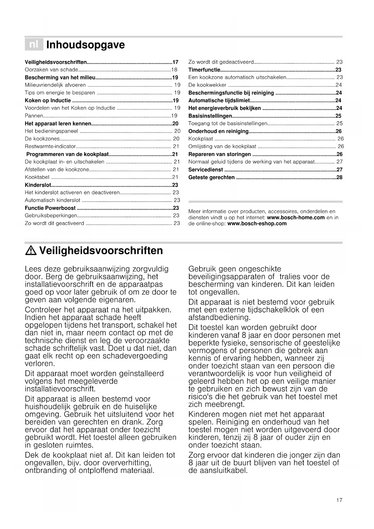- Geteste gerechten Produktinfo Meer informatie over producten, accessoires, onderdelen en diensten vindt u op het internet: www.bosch-home.com en in de online-shop: www.bosch-eshop.com : Veiligheidsvoorschriften Lees deze gebruiksaanwijzing zorgvuldig door. Berg de gebruiksaanwijzing, het installatievoorschrift en de apparaatpas goed op voor later gebruik of om ze door te geven aan volgende eigenaren. Controleer het apparaat na het uitpakken. Indien het apparaat schade heeft opgelopen tijdens het transport, schakel het dan niet in, maar neem contact op met de technische dienst en leg de veroorzaakte schade schriftelijk vast. Doet u dat niet, dan gaat elk recht op een schadevergoeding verloren. Dit apparaat moet worden geïnstalleerd volgens het meegeleverde installatievoorschrift. Dit apparaat is alleen bestemd voor huishoudelijk gebruik en de huiselijke omgeving. Gebruik het uitsluitend voor het bereiden van gerechten en drank. Zorg ervoor dat het apparaat onder toezicht gebruikt wordt. Het toestel alleen gebruiken in gesloten ruimtes. Dek de kookplaat niet af. Dit kan leiden tot ongevallen, bijv. door oververhitting, ontbranding of ontploffend materiaal. Gebruik geen ongeschikte beveiligingsapparaten of tralies voor de bescherming van kinderen. Dit kan leiden tot ongevallen. Dit apparaat is niet bestemd voor gebruik met een externe tijdschakelklok of een afstandbediening. Dit toestel kan worden gebruikt door kinderen vanaf 8 jaar en door personen met beperkte fysieke, sensorische of geestelijke vermogens of personen die gebrek aan kennis of ervaring hebben, wanneer zij onder toezicht staan van een persoon die verantwoordelijk is voor hun veiligheid of geleerd hebben het op een veilige manier te gebruiken en zich bewust zijn van de risico's die het gebruik van het toestel met zich meebrengt. Kinderen mogen niet met het apparaat spelen. Reiniging en onderhoud van het toestel mogen niet worden uitgevoerd door kinderen, tenzij zij 8 jaar of ouder zijn en onder toezicht staan. Zorg ervoor dat kinderen die jonger zijn dan 8 jaar uit de buurt blijven van het toestel of de aansluitkabel.18 Heeft u een pacemaker of soortgelijk medisch hulpmiddel geïmplanteerd, dan dient u speciale voorzorgsmaatregelen in acht nemen bij het gebruiken of in de buurt komen van inductiekookplaten als die in werking zijn. Raadpleeg uw arts of de fabrikant van het hulpmiddel, om er zeker van te zijn dat het voldoet aan de geldige regelgeving en informeer omtrent mogelijke incompatibiliteit. Risico van brand! p. 28