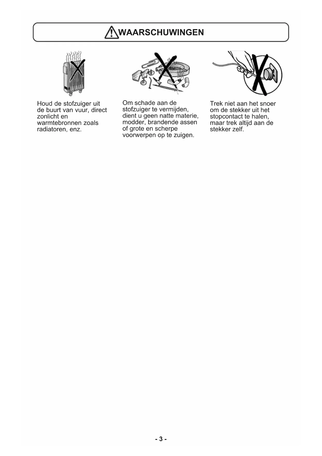 - Garantie - 2 -- 3 - Om schade aan de stofzuiger te vermijden, dient u geen natte materie, modder, brandende assen of grote en scherpe voorwerpen op te zuigen. Trek niet aan het snoer om de stekker uit het stopcontact te halen, maar trek altijd aan de stekker zelf. Houd de stofzuiger uit de buurt van vuur, direct zonlicht en warmtebronnen zoals radiatoren, enz. WAARSCHUWINGEN• Laat de stekker van de stofzuiger niet in het stopcontact zitten. Haal de stekker uit het stopcontact wanneer niet in gebruik en voordat u het apparaat reinigt of onderhoud uitvoert. p. 19