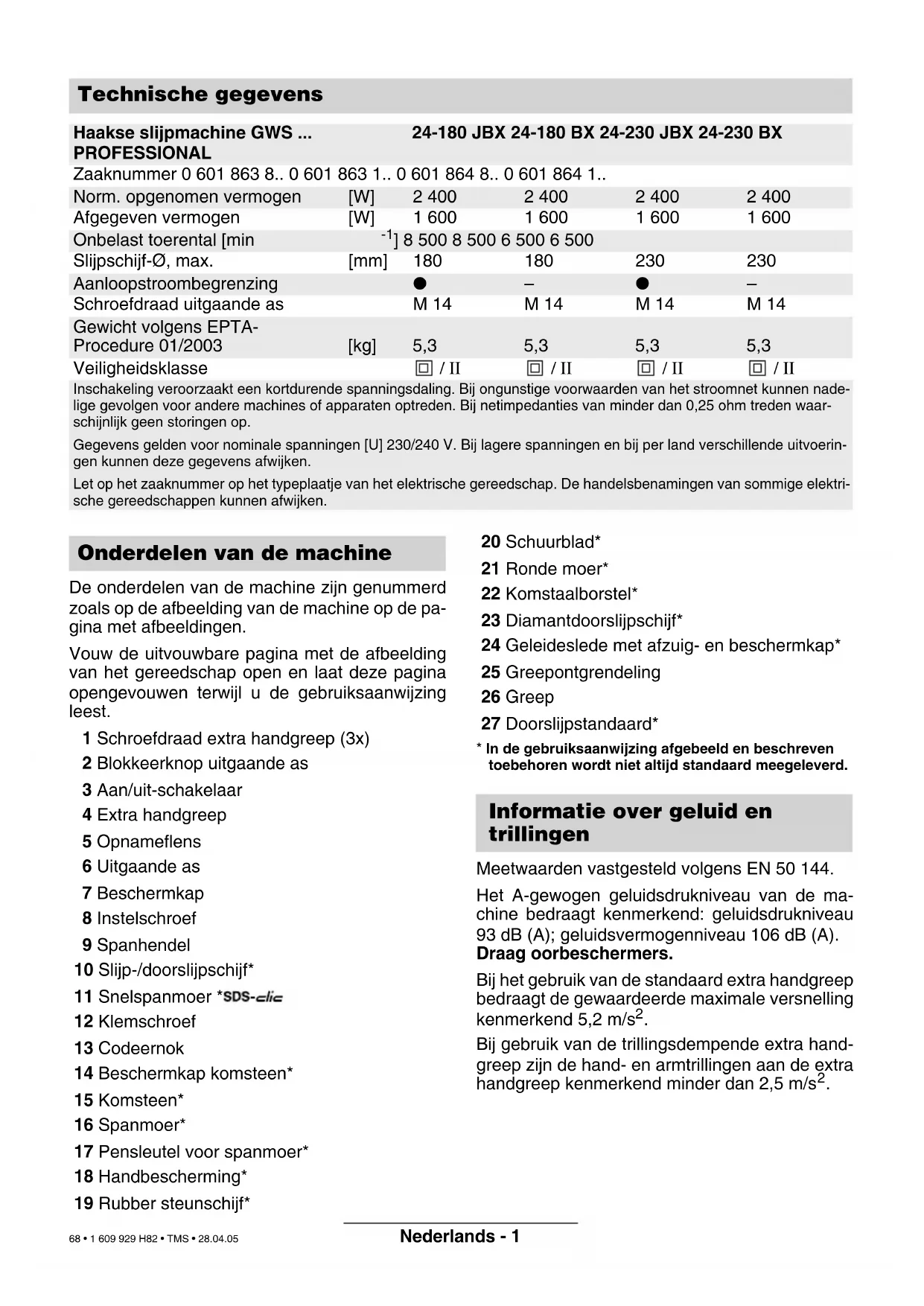 ] 8 500 8 500 6 500 6 500 Slijpschijf-Ø, max. [mm] 180 180 230 230 Aanloopstroombegrenzing ● – ● – Schroefdraad uitgaande as M 14 M 14 M 14 M 14 Gewicht volgens EPTA- Procedure 01/2003 [kg] 5,3 5,3 5,3 5,3 Veiligheidsklasse / II / II / II / II Inschakeling veroorzaakt een kortdurende spanningsdaling. Bij ongunstige voorwaarden van het stroomnet kunnen nade- lige gevolgen voor andere machines of apparaten optreden. Bij netimpedanties van minder dan 0,25 ohm treden waar- schijnlijk geen storingen op. Gegevens gelden voor nominale spanningen [U] 230/240 V. Bij lagere spanningen en bij per land verschillende uitvoerin- gen kunnen deze gegevens afwijken. Let op het zaaknummer op het typeplaatje van het elektrische gereedschap. De handelsbenamingen van sommige elektri- sche gereedschappen kunnen afwijken. Onderdelen van de machine Informatie over geluid en trillingen 1 609 929 H82.book Seite 1 Dienstag, 3. Mai 2005 3:11 15 68 • 1 609 929 H82 • TMS • 28.04.05Nederlands - 2 De machine is bestemd voor het doorslijpen, af- bramen en borstelen van metaal en steen zonder gebruik van water. Voor het doorslijpen van steen is een geleideslede voorgeschreven. Voor sleuven in dragende muren geldt norm DIN 1053 deel 1 of gelden landspecifieke bepa- lingen. Deze voorschriften moeten beslist in acht worden genomen. Raadpleeg voor het begin van de werkzaamheden de verantwoordelijke bouwkun- dige, architect of de met de leiding belaste bouwopzichter. Lees alle voorschriften. Wanneer de volgende voorschriften niet in acht worden genomen, kan dit een elektrische schok, brand of ernstig letsel tot gevolg hebben. Bovendien moeten de algemene veiligheidsvoor- schriften in de bijgevoegde brochure of in het ge- deelte in het midden van deze gebruiksaanwij- zing worden opgevolgd. BEWAAR DEZE VOORSCHRIFTEN GOED. Draag een veiligheidsbril. Draag een gehoorbescherming. ■ Houd het elektrische gereedschap tijdens de werkzaamheden stevig met beide han- den vast en zorg ervoor dat u stevig staat. Het elektrische gereedschap wordt met twee handen veiliger geleid. ■ Zet het werkstuk vast. Een met spanvoorzie- ningen of een bankschroef vastgehouden werkstuk wordt beter vastgehouden dan u met uw hand kunt doen. ■ Tref veiligheidsmaatregelen wanneer bij werkzaamheden stoffen kunnen ontstaan die schadelijk voor de gezondheid, brand- baar of explosief zijn. Bijvoorbeeld: sommige soorten stof worden beschouwd als kankerver- wekkend. Gebruik een afzuiging voor stof en spanen en draag een stofmasker. ■ Houd uw werkplek schoon. Materiaalmeng- sels zijn bijzonder gevaarlijk. Stof van lichte metalen kan ontvlammen of exploderen. ■ Bewerk geen asbesthoudend materiaal. As- best geldt als kankerverwekkend. ■ Gebruik het elektrische gereedschap niet met een beschadigde kabel. Raak de be- schadigde kabel niet aan en trek de stekker uit het stopcontact als de kabel tijdens de werkzaamheden beschadigd wordt. Be- schadigde kabels vergroten het risico van een elektrische schok. ■ Sluit elektrische gereedschappen die bui- tenshuis worden gebruikt aan via een aard- lekschakelaar. Algemene waarschuwingen voor slijpen, schuren, borstelen, polijsten en doorslijpen: ■ Dit elektrische gereedschap is bestemd voor gebruik als slijpmachine, schuurma- chine, borstelmachine, polijstmachine en doorslijpmachine. Neem alle waarschuwin- gen, aanwijzingen, afbeeldingen en gege- vens die u bij het elektrische gereedschap ontvangt in acht. Als u de volgende aanwij- zingen niet in acht neemt, kunnen een elektri- sche schok, brand en/of ernstig letsel het ge- volg zijn. ■ Gebruik uitsluitend toebehoren dat door de fabrikant speciaal voor dit elektrische ge- reedschap is voorzien en geadviseerd. Het feit dat u het toebehoren aan het elektrische gereedschap kunt bevestigen, waarborgt nog geen veilig gebruik. ■ Het toegestane toerental van het inzetge- reedschap moet minstens zo hoog zijn als het maximale toerental dat op het elektri- sche gereedschap is aangegeven. Toebe- horen dat sneller draait dan is toegestaan, kan onherstelbaar worden beschadigd. ■ De buitendiameter en de dikte van het in- zetgereedschap moeten overeenkomen met de maatgegevens van het elektrische gereedschap. Inzetgereedschappen met on- juiste afmetingen kunnen niet voldoende afge- schermd of gecontroleerd worden. ■ Slijpschijven, flenzen, steunschijven en an- der toebehoren moeten nauwkeurig op de uitgaande as van het elektrische gereed- schap passen. Inzetgereedschappen die niet nauwkeurig op de uitgaande as van het elektri- sche gereedschap passen, draaien ongelijk- matig, trillen sterk en kunnen tot het verlies van de controle leiden. Gebruik volgens bestemming Bouwkundige aspecten Voor uw veiligheid 1 609 929 H82.book Seite 2 Dienstag, 3. Mai 2005 3:11 15 69 • 1 609 929 H82 • TMS • 28.04.05Nederlands - 3 ■ Gebruik geen beschadigde inzetgereed- schappen. Controleer voor het gebruik al- tijd inzetgereedschappen zoals slijpschij- ven op afsplinteringen en scheuren, steun- schijven op scheuren of sterke slijtage en draadborstels op losse of gebroken dra- den. Als het elektrische gereedschap of het inzetgereedschap valt, dient u te controle- ren of het beschadigd is, of gebruik een on- beschadigd inzetgereedschap. Als u het in- zetgereedschap hebt gecontroleerd en in- gezet, laat u het elektrische gereedschap een minuut lang met het maximale toeren- tal lopen. Daarbij dient u en dienen andere personen uit de buurt van het rond- draaiende inzetgereedschap te blijven. Be- schadigde inzetgereedschappen breken meestal gedurende deze testtijd. ■ Draag persoonlijke beschermende uitrus- ting. Gebruik afhankelijk van de toepassing een volledige gezichtsbescherming, oog- bescherming of veiligheidsbril. Draag voor zover van toepassing een stofmasker, een gehoorbescherming, werkhandschoenen of een speciaal schort dat kleine slijp- en metaaldeeltjes tegenhoudt. Uw ogen moe- ten worden beschermd tegen wegvliegende deeltjes die bij verschillende toepassingen ont