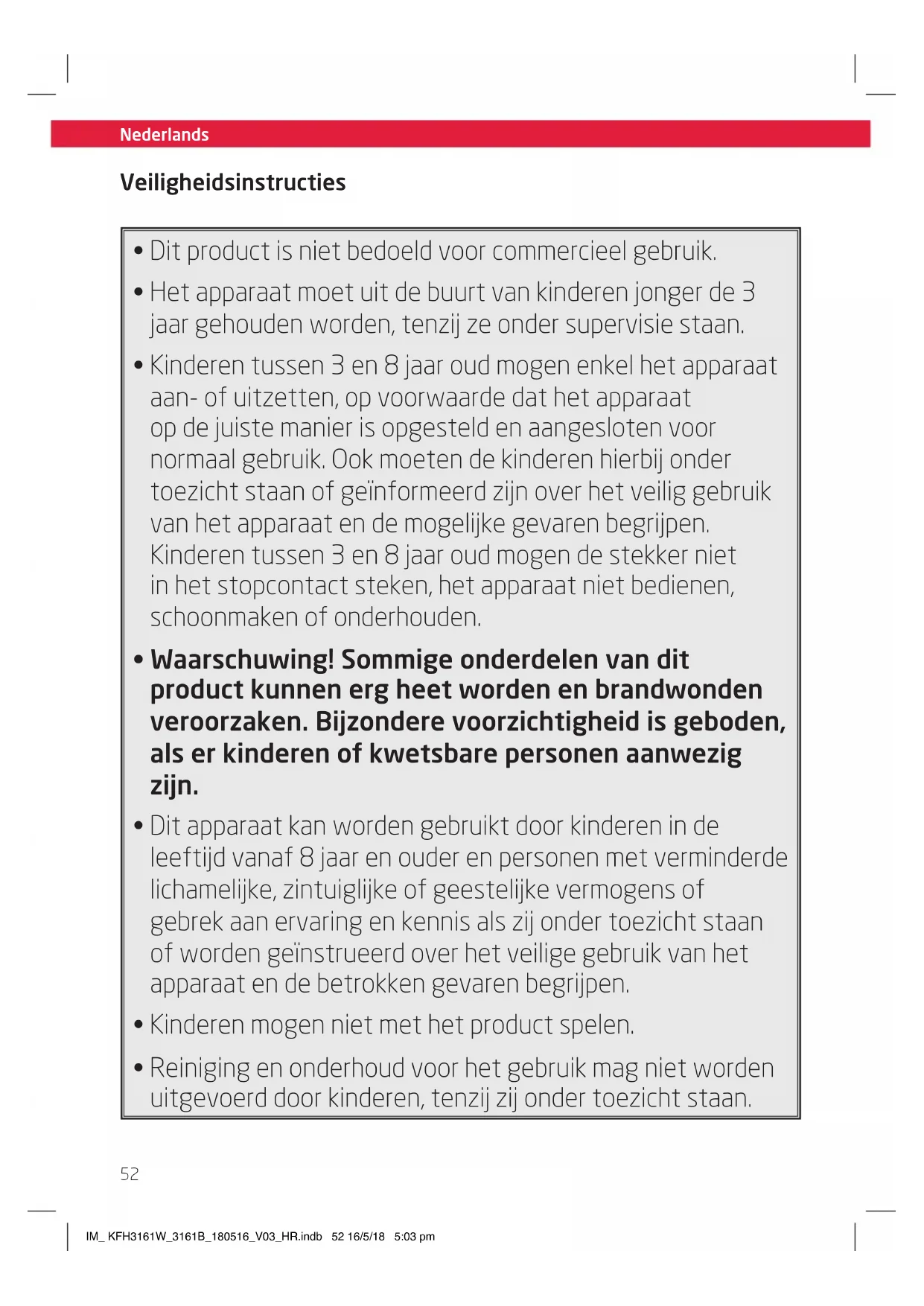 - Reiniging en onderhoud voor het gebruik mag niet worden uitgevoerd door kinderen, tenzij zij onder toezicht staan. Veiligheidsinstructies IM_ KFH3161W_3161B_180516_V03_HR.indb 52 16/5/18 5:03 pmNederlands