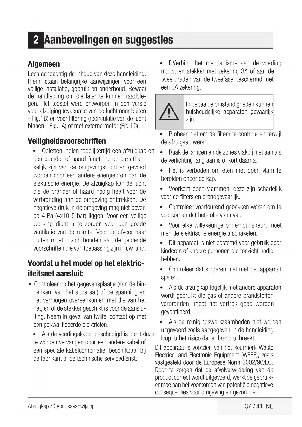 Lees aandachtig de inhoud van deze handleiding. Hierin staan belangrijke aanwijzingen voor een veilige installatie, gebruik en onderhoud. Bewaar de handleiding om die later te kunnen raadplegen. Het toestel werd ontworpen in een versie voor afzuiging (evacuatie van de lucht naar buiten - Fig.1B) en voor filtering (recirculatie van de lucht binnen - Fig.1A) of met externe motor (Fig.1C).