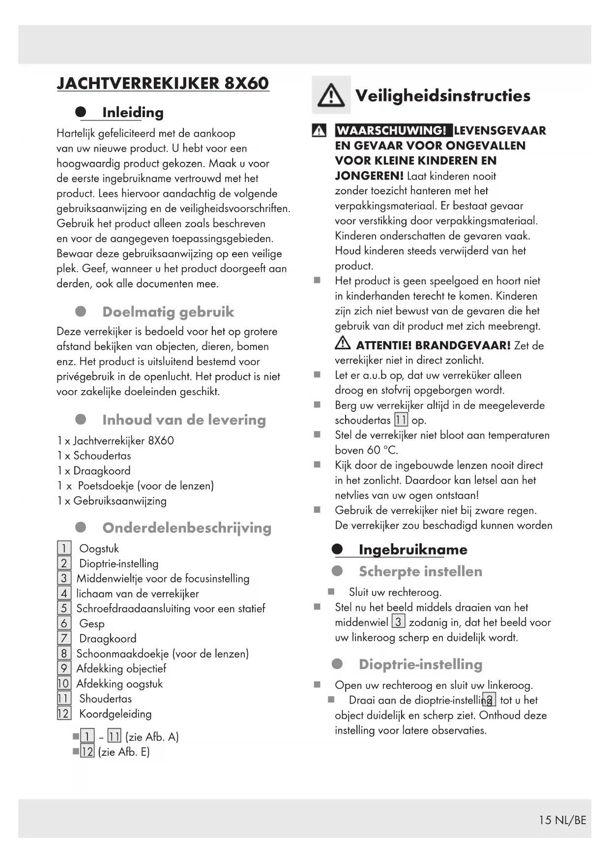 JONGEREN! Laat kinderen nooit zonder toezicht hanteren met het verpakkingsmateriaal. Er bestaat gevaar voor verstikking door verpakkingsmateriaal. Kinderen onderschatten de gevaren vaak. Houd kinderen steeds verwijderd van het product. ¾ Het product is geen speelgoed en hoort niet in kinderhanden terecht te komen. Kinderen zijn zich niet bewust van de gevaren die het gebruik van dit product met zich meebrengt. m ATTENTIE! BRANDGEVAAR! Zet de verrekijker niet in direct zonlicht. ¾ Let er a.u.b op, dat uw verreküker alleen droog en stofvrij opgeborgen wordt. ¾ Berg uw verrekijker altijd in de meegeleverde schoudertas