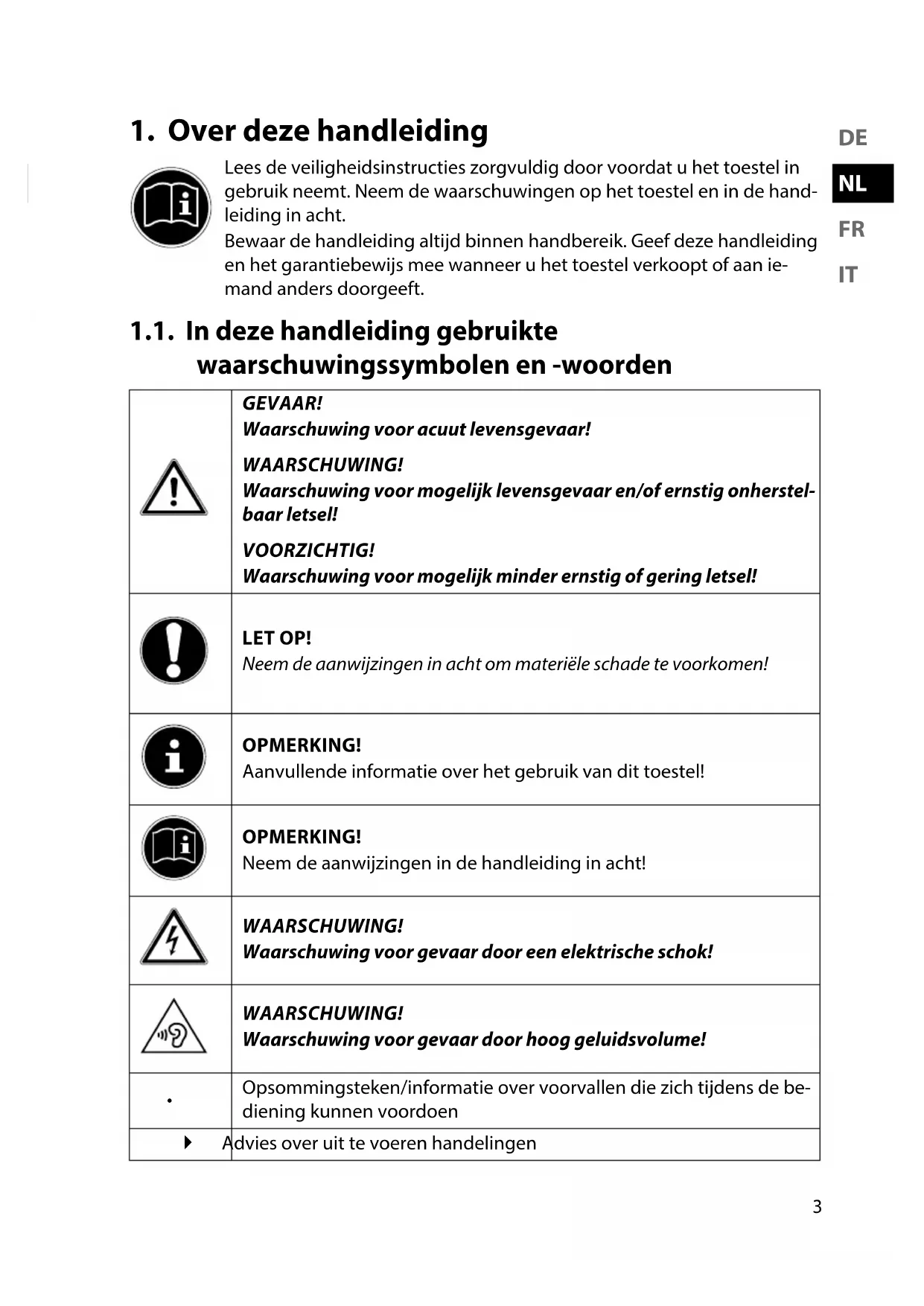 Lees de veiligheidsinstructies zorgvuldig door voordat u het toestel in gebruik neemt. Neem de waarschuwingen op het toestel en in de hand- leiding in acht. Bewaar de handleiding altijd binnen handbereik. Geef deze handleiding en het garantiebewijs mee wanneer u het toestel verkoopt of aan ie- mand anders doorgeeft. 1.1. In deze handleiding gebruikte waarschuwingssymbolen en -woorden GEVAAR! Waarschuwing voor acuut levensgevaar! WAARSCHUWING! Waarschuwing voor mogelijk levensgevaar en/of ernstig onherstel- baar letsel! VOORZICHTIG! Waarschuwing voor mogelijk minder ernstig of gering letsel! LET OP! Neem de aanwijzingen in acht om materiële schade te voorkomen! OPMERKING! Aanvullende informatie over het gebruik van dit toestel! OPMERKING! Neem de aanwijzingen in de handleiding in acht! WAARSCHUWING! Waarschuwing voor gevaar door een elektrische schok! WAARSCHUWING! Waarschuwing voor gevaar door hoog geluidsvolume!