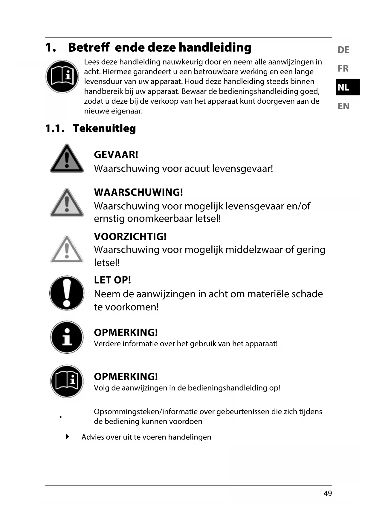 Lees deze handleiding nauwkeurig door en neem alle aanwijzingen in acht. Hiermee garandeert u een betrouwbare werking en een lange levensduur van uw apparaat. Houd deze handleiding steeds binnen handbereik bij uw apparaat. Bewaar de bedieningshandleiding goed, zodat u deze bij de verkoop van het apparaat kunt doorgeven aan de nieuwe eigenaar. 1.1. Tekenuitleg GEVAAR! Waarschuwing voor acuut levensgevaar! WAARSCHUWING! Waarschuwing voor mogelijk levensgevaar en/of ernstig onomkeerbaar letsel! VOORZICHTIG! Waarschuwing voor mogelijk middelzwaar of gering letsel! LET OP! Neem de aanwijzingen in acht om materiële schade te voorkomen! OPMERKING! Verdere informatie over het gebruik van het apparaat! OPMERKING! Volg de aanwijzingen in de bedieningshandleiding op!