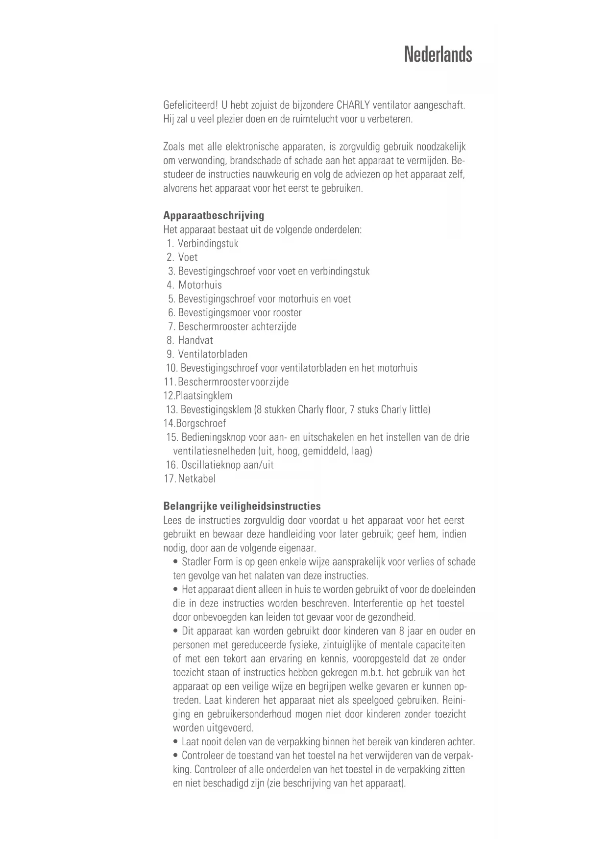Download de handleiding voor uw Ventilator in PDF-formaat gratis! Vind uw handleiding Charly Floor - STADLER FORM en neem uw elektronisch apparaat weer in handen. Op deze pagina staan alle documenten die nodig zijn voor het gebruik van uw apparaat. Charly Floor van het merk STADLER FORM.