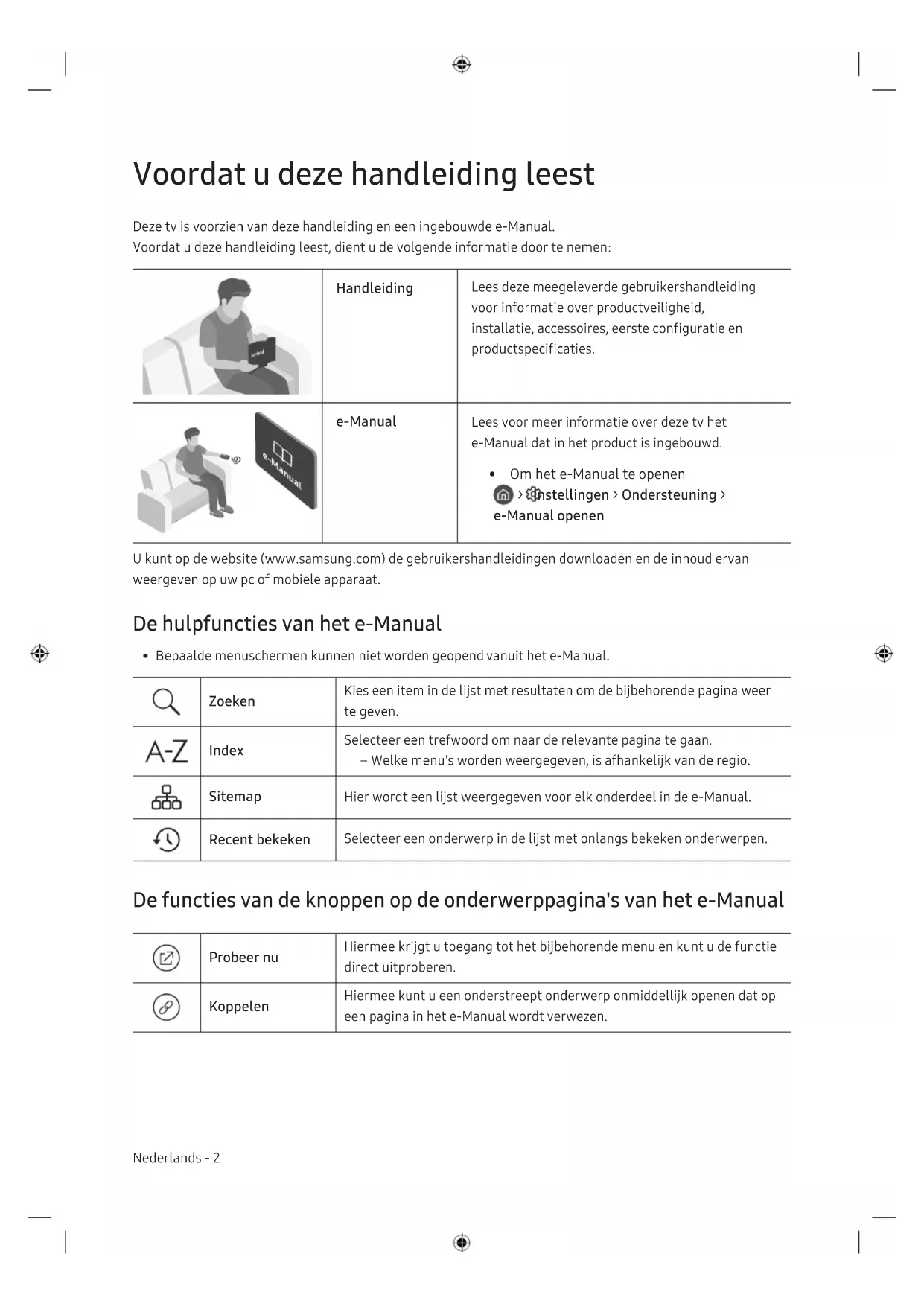 - Om het e-Manual te openen > Instellingen > Ondersteuning > e-Manual openen U kunt op de website (www.samsung.com) de gebruikershandleidingen downloaden en de inhoud ervan weergeven op uw pc of mobiele apparaat. De hulpfuncties van het e-Manual