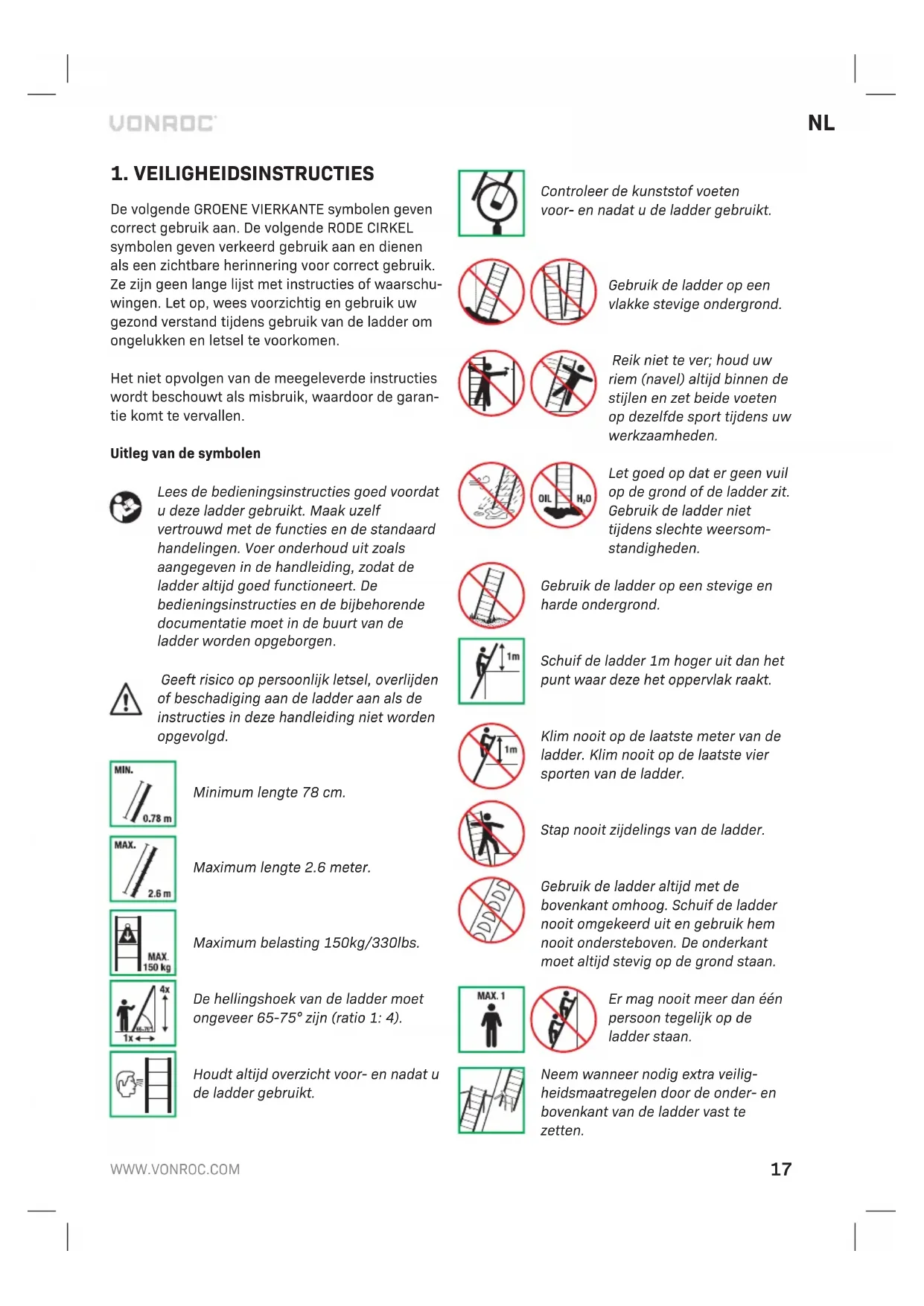 De volgende GROENE VIERKANTE symbolen geven correct gebruik aan. De volgende RODE CIRKEL symbolen geven verkeerd gebruik aan en dienen als een zichtbare herinnering voor correct gebruik. Ze zijn geen lange lijst met instructies of waarschu- wingen. Let op, wees voorzichtig en gebruik uw gezond verstand tijdens gebruik van de ladder om ongelukken en letsel te voorkomen. Het niet opvolgen van de meegeleverde instructies wordt beschouwt als misbruik, waardoor de garan- tie komt te vervallen. Uitleg van de symbolen Lees de bedieningsinstructies goed voordat u deze ladder gebruikt. Maak uzelf vertrouwd met de functies en de standaard handelingen. Voer onderhoud uit zoals aangegeven in de handleiding, zodat de ladder altijd goed functioneert. De bedieningsinstructies en de bijbehorende documentatie moet in de buurt van de ladder worden opgeborgen. Geeft risico op persoonlijk letsel, overlijden of beschadiging aan de ladder aan als de instructies in deze handleiding niet worden opgevolgd.