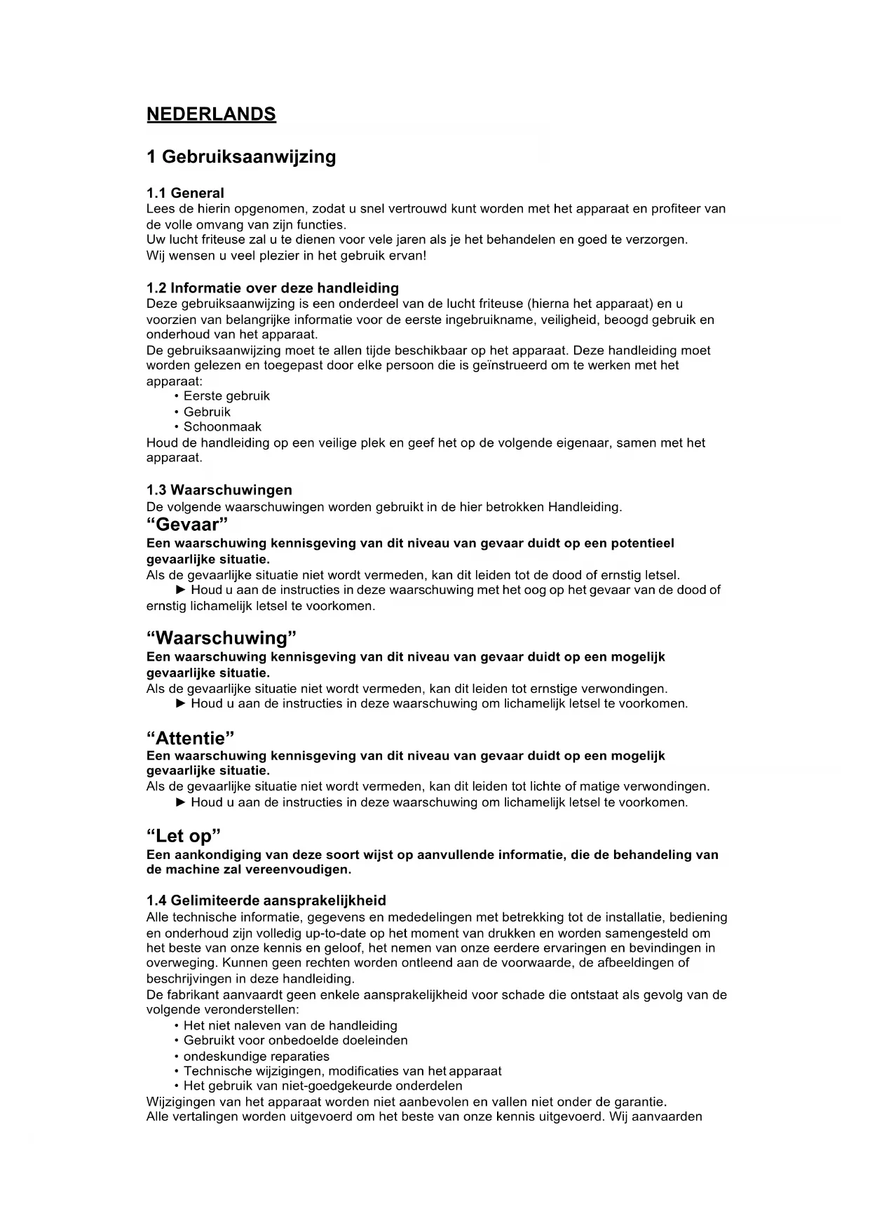 Deze gebruiksaanwijzing is een onderdeel van de lucht friteuse (hierna het apparaat) en u voorzien van belangrijke informatie voor de eerste ingebruikname, veiligheid, beoogd gebruik en onderhoud van het apparaat.
