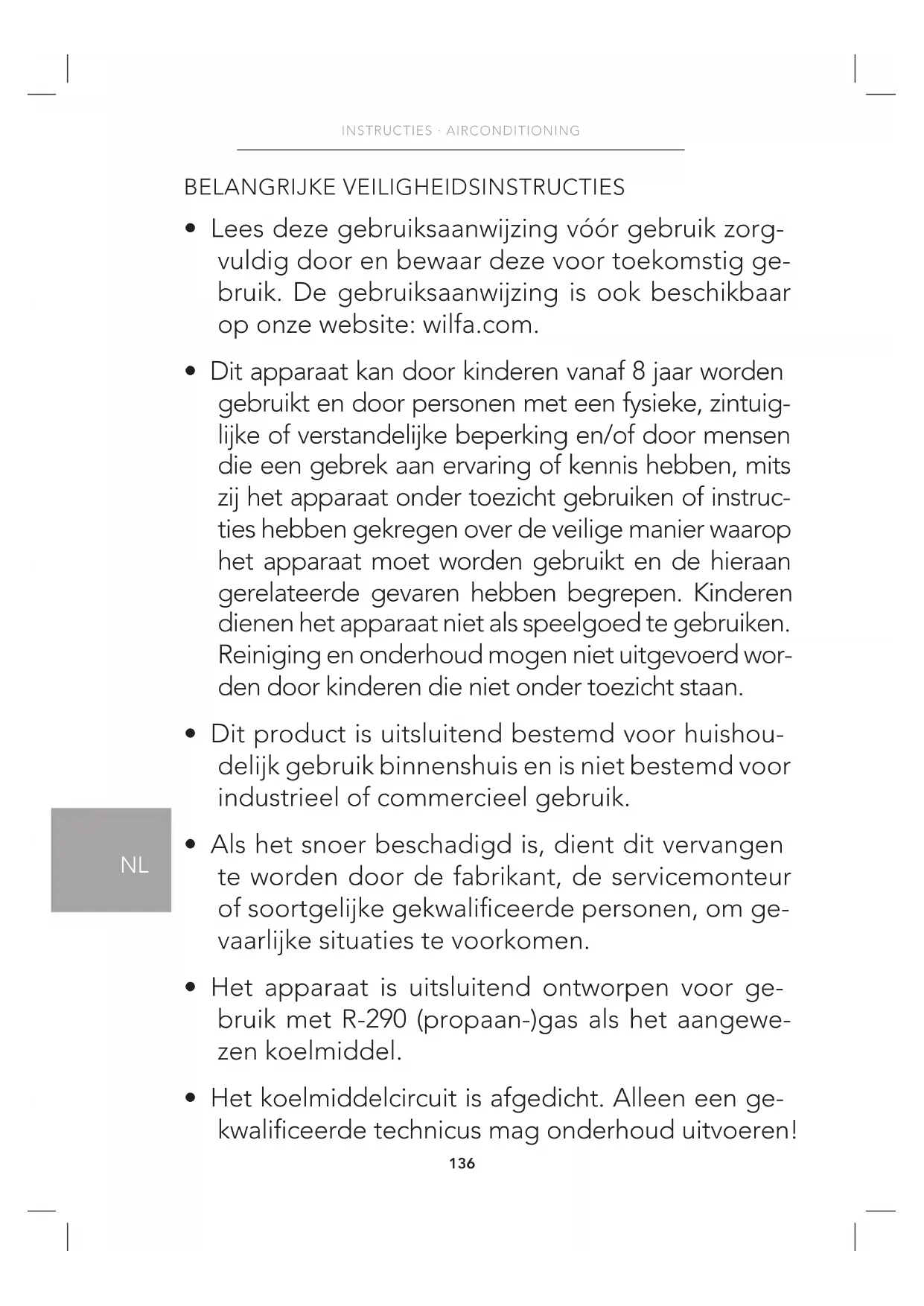 Ga voor ondersteuning naar wilfa.com en raadpleeg onze klantenservice-/on- dersteuningspagina. Hier vindt u veelgestelde vragen, reserveonderdelen, tips en trucs en al onze contactgegevens. RECYCLING Deze markering geeft aan dat u dit product in de gehele Europese Unie niet met ander huishoudelijk afval mag meegeven. Om mogelijke schade aan het milieu of de gezondheid van mensen als gevolg van ongecontroleerde afvalverwijdering te voorkomen, dient het product op een verantwoorde manier gerecycled te worden om duurzaam hergebruik van materialen te stimuleren. Gebruik de retour- en inzamelingssystemen om uw gebruikte apparaat in te leveren, of neem contact op met de winkel waar u het product hebt gekocht. De winkel kan het product terugnemen om het op veilige en milieuverantwoorde wijze te recyclen. Het vrijgeven van koelmiddel in de atmosfeer is ten strengste verboden!156 INSTRUKCJE · KLIMATYZATOR PL157