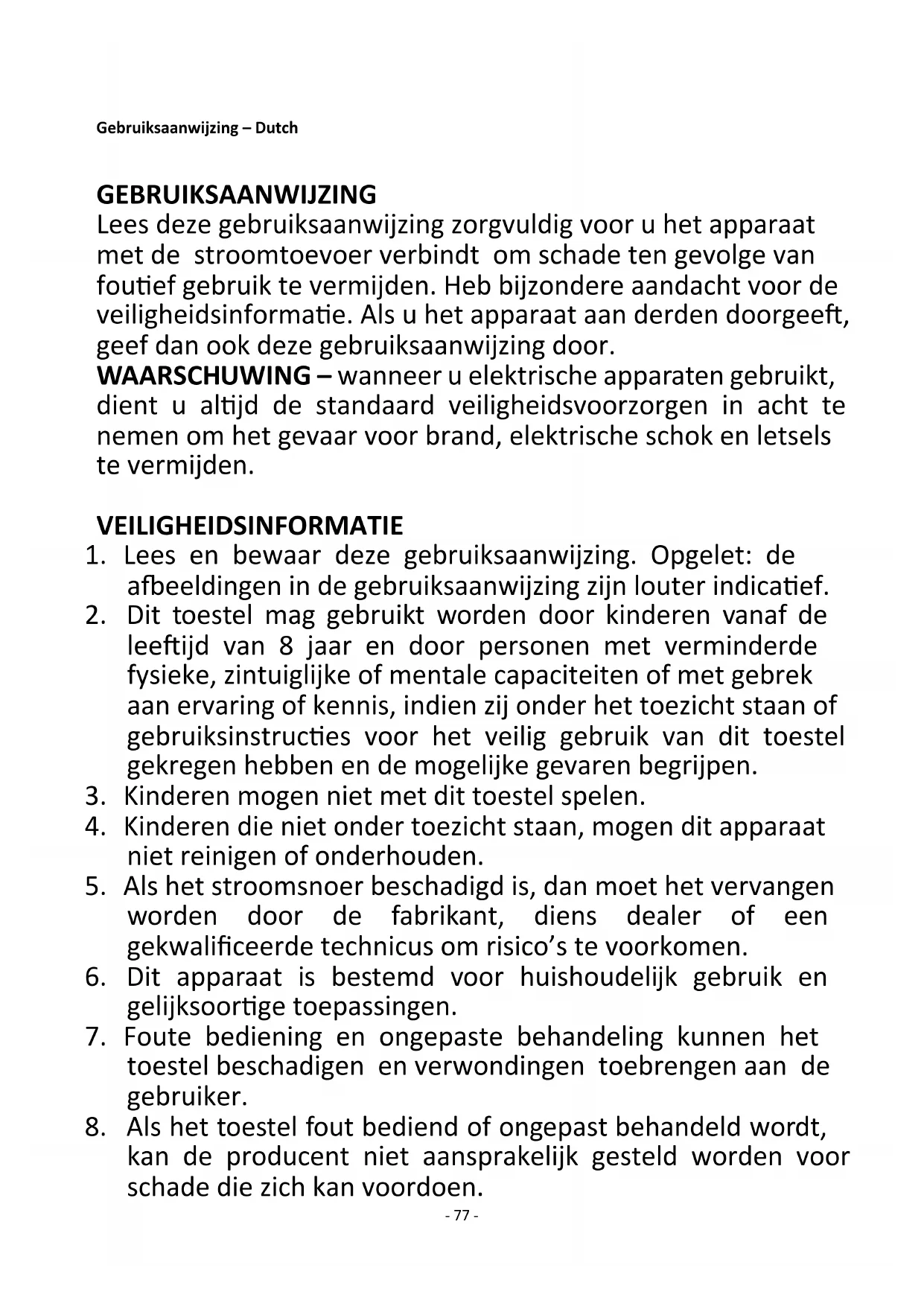 6. Dit apparaat is bestemd voor huishoudelijk gebruik en