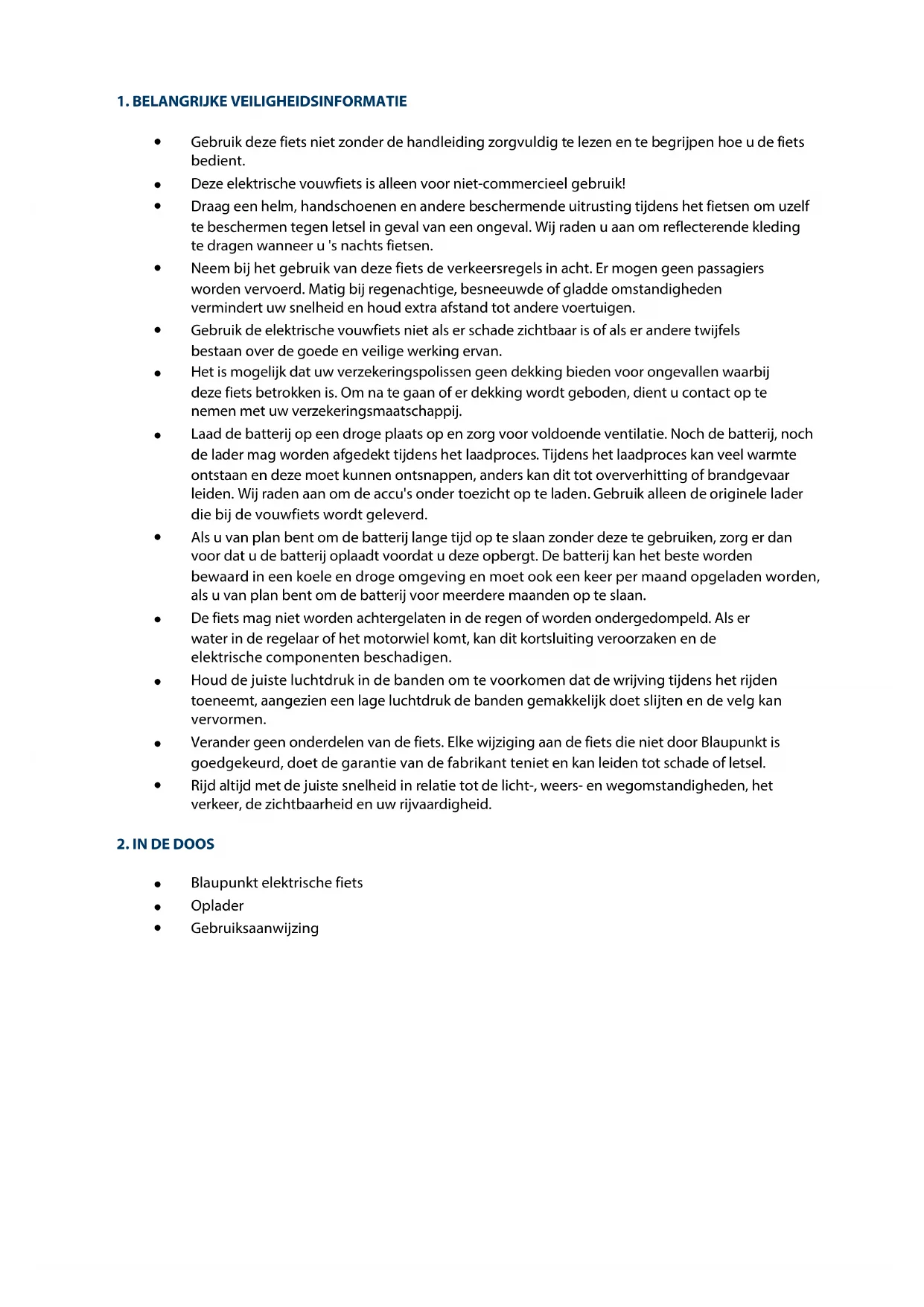 Salvo modifiche tecniche! Wij feliciteren u met de aankoop van uw nieuwe Blaupunkt elektrische vouwfiets. Wij willen graag dat u lang plezier beleeft aan uw elektrische fiets. Lees deze handleiding daarom aandachtig door. Als u, tegen de verwachting in, problemen heeft met de elektrische fiets, controleer dan met behulp van de handleiding of u deze kunt oplossen. Let op: Deze handleiding is geen gedetailleerde handleiding voor service, onderhoud en reparaties. Om de veiligheid van uw elektrische fiets te waarborgen, mogen reparaties alleen worden uitgevoerd door een specialist. Uw dealer en de Blaupunkt service helpen u graag verder. INHOUDSOPGAVE