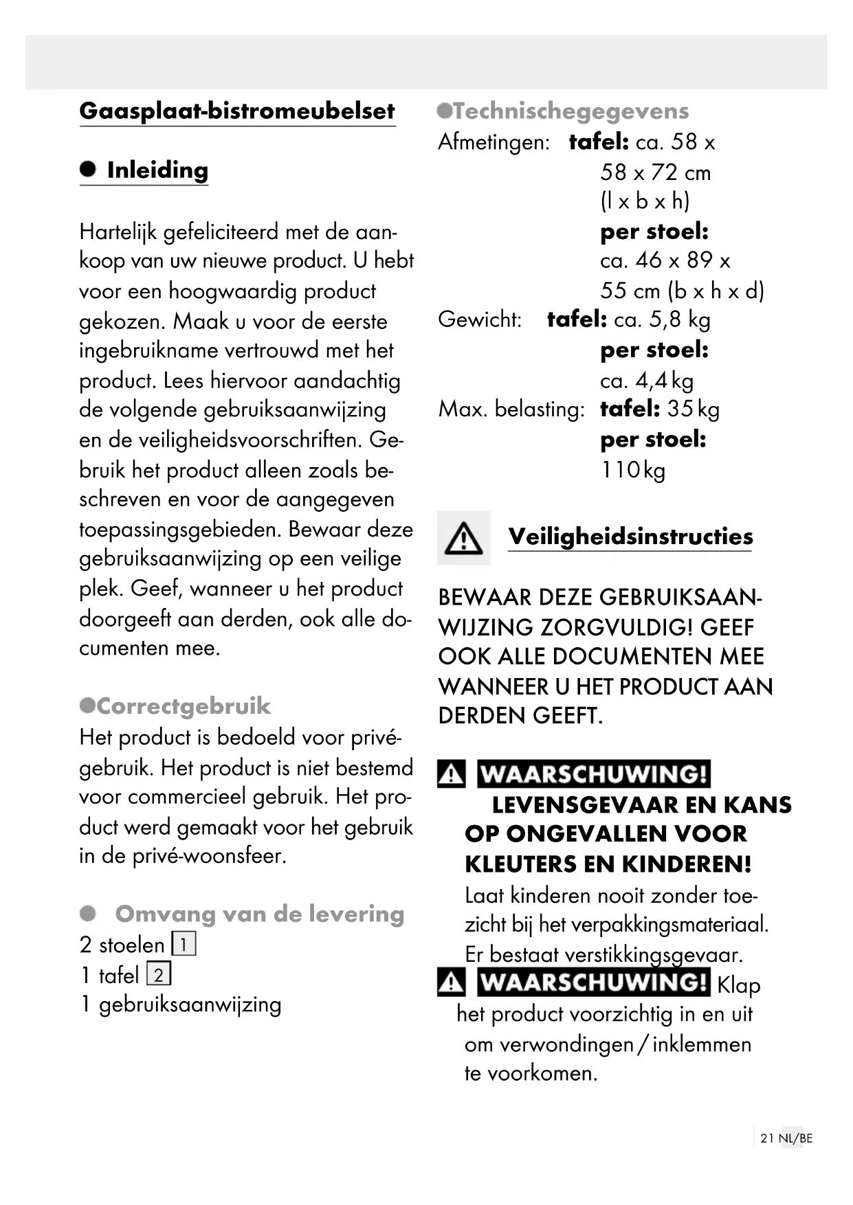 KLEUTERS EN KINDEREN! Laat kinderen nooit zonder toe- zicht bij het verpakkingsmateriaal. Er bestaat verstikkingsgevaar. Klap het product voorzichtig in en uit om verwondingen / inklemmen te voorkomen.22 NL/BE Stel het product veilig bij extreme weersomstandigheden, bijv. bij harde wind. Let voor gebruik van het product op de juiste stabiliteit. Plaats het product voor het geb ruik op een vlakke, vaste ondergrond, anders kan het product instabiel worden en opzij vallen of kante- len. Dit kan tot verwondingen of materiële schade leiden. Let erop dat het product volledig geopend is voordat u het ge bruikt. Het product is geen speelgoed en mag alleen onder toezicht van volwassenen worden gebruikt. Controleer het product voor ieder gebruik op beschadiging of slijtage. Gebruik het product alleen wanneer het in onberispe- lijke staat verkeert. Gebruik het product niet bij zichtbare of vermoedelijke beschadigingen. Max. 110 kg/ 35 kg Houd rekening met de maximale belastbaar- heid van 110 kg voor elke stoel en 35 kg voor de tafel. Als deze gewichtsgrens wordt overschred en, kan dit leiden tot letsel en / of materiële schade. Het geringe gewicht en de een- voudige constructie van de tafel heeft tot gevolg dat deze niet zo stabiel is als een normale tafel. Belast de tafel niet boven de 35 kg en vermijd eenzijdige belastingen. Het product is geen klim- of speeltoestel! Let erop dat personen, met name kinderen, niet op het product gaan staan of zich eraan omhoog trek- ken. Het product kan omvallen. Gebruik het product uitsluitend voor het beoogde doeleinde. Ga niet op de tafel zitten of staan. Ga niet op de stoelen staan. Ga nooit op rugleuning van de stoelen zitten. De stoelen mogen slechts door één persoon worden gebruikt. Gebruik het product niet in de buurt van open vuur. Let er voor het gebruik op dat het vergrendelingssysteem is vastgezet.