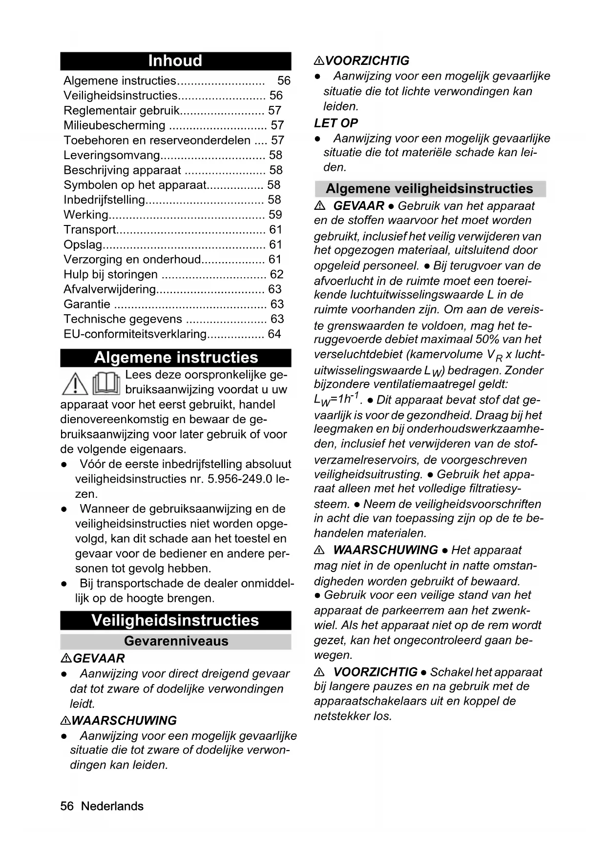 Comprimento do cabo m 1056 Nederlands Inhoud Algemene instructies Lees deze oorspronkelijke ge- bruiksaanwijzing voordat u uw apparaat voor het eerst gebruikt, handel dienovereenkomstig en bewaar de ge- bruiksaanwijzing voor later gebruik of voor de volgende eigenaars. ● Vóór de eerste inbedrijfstelling absoluut veiligheidsinstructies nr. 5.956-249.0 le- zen. ● Wanneer de gebruiksaanwijzing en de veiligheidsinstructies niet worden opge- volgd, kan dit schade aan het toestel en gevaar voor de bediener en andere per- sonen tot gevolg hebben. ● Bij transportschade de dealer onmiddel- lijk op de hoogte brengen. Veiligheidsinstructies Gevarenniveaus GEVAAR ● Aanwijzing voor direct dreigend gevaar dat tot zware of dodelijke verwondingen leidt. 몇 WAARSCHUWING ● Aanwijzing voor een mogelijk gevaarlijke situatie die tot zware of dodelijke verwon- dingen kan leiden. 몇 VOORZICHTIG ● Aanwijzing voor een mogelijk gevaarlijke situatie die tot lichte verwondingen kan leiden. LET OP ● Aanwijzing voor een mogelijk gevaarlijke situatie die tot materiële schade kan lei- den. Algemene veiligheidsinstructies GEVAAR ● Gebruik van het apparaat en de stoffen waarvoor het moet worden gebruikt, inclusief het veilig verwijderen van het opgezogen materiaal, uitsluitend door opgeleid personeel. ● Bij terugvoer van de afvoerlucht in de ruimte moet een toerei- kende luchtuitwisselingswaarde L in de ruimte voorhanden zijn. Om aan de vereis- te grenswaarden te voldoen, mag het te- ruggevoerde debiet maximaal 50% van het verseluchtdebiet (kamervolume V