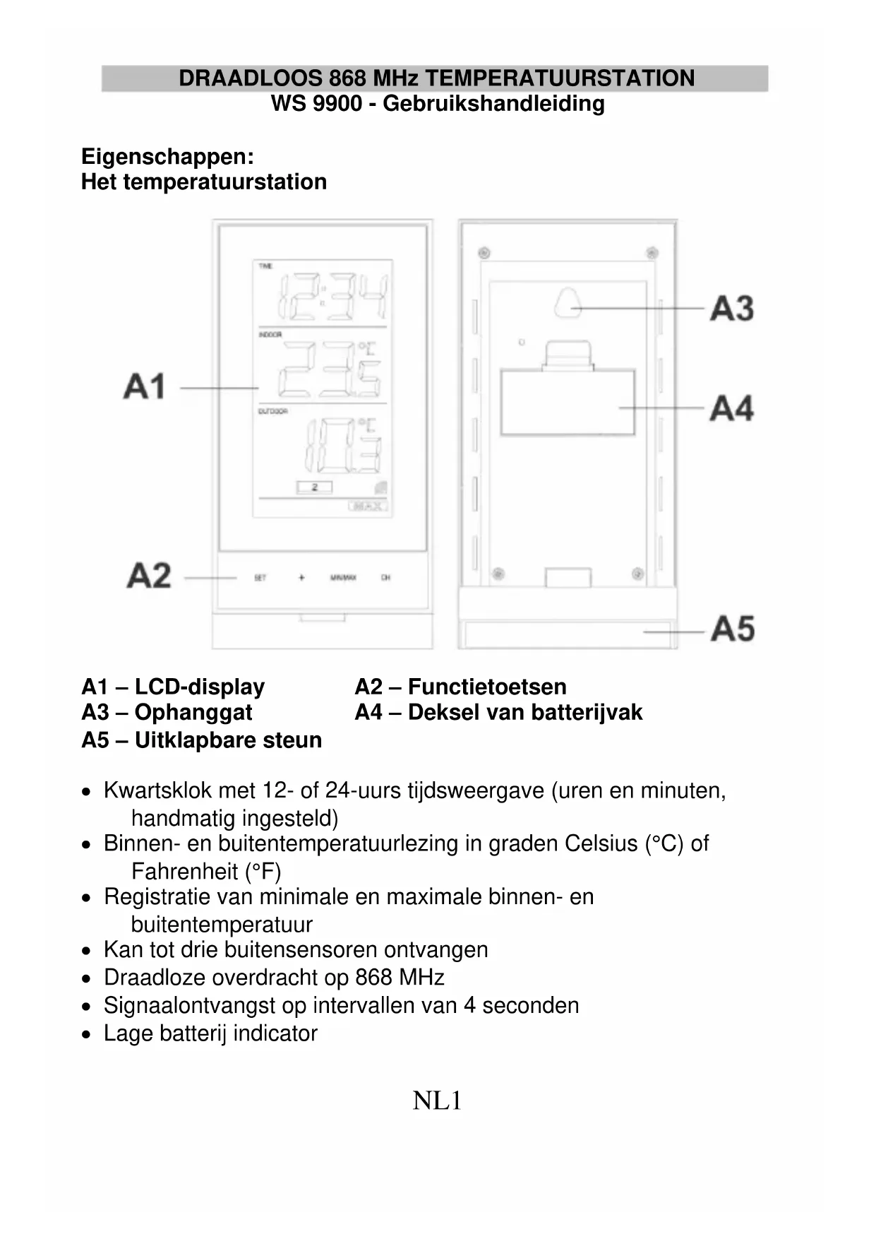 A1 – LCD-display A2 – Functietoetsen A3 – Ophanggat A4 – Deksel van batterijvak A5 – Uitklapbare steun Kwartsklok met 12- of 24-uurs tijdsweergave (uren en minuten, handmatig ingesteld) Binnen- en buitentemperatuurlezing in graden Celsius (°C) of Fahrenheit (°F) Registratie van minimale en maximale binnen- en buitentemperatuur Kan tot drie buitensensoren ontvangen Draadloze overdracht op 868 MHz Signaalontvangst op intervallen van 4 seconden Lage batterij indicatorNL2 Muurmontage of geplaatst op een tafel (uitklapbare tafelsteun inbegrepen) De buitentemperatuursensor Externe signaaloverdracht van buitentemperatuur naar temperatuurstation op 868 MHz Douchebestendige behuizing Behuizing voor muurmontage (Installeer op een beschutte plek. Vermijd directe regen en direct zonlicht) Instelling: Wanneer één sensor wordt gebruikt: