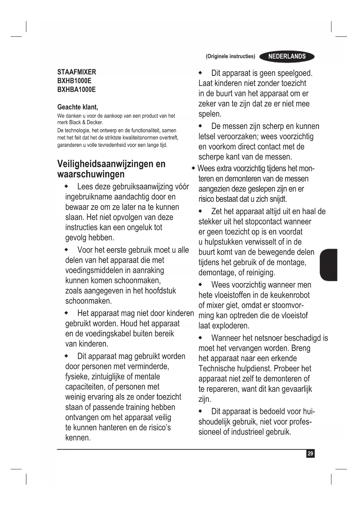 STAAFMIXER BXHB1000E BXHBA1000E Geachte klant, We danken u voor de aankoop van een product van het merk Black & Decker. De technologie, het ontwerp en de functionaliteit, samen met het feit dat het de striktste kwaliteitsnormen overtreft, garanderen u volle tevredenheid voor een lange tijd. Veiligheidsaanwijzingen en waarschuwingen Lees deze gebruiksaanwijzing vóór ingebruikname aandachtig door en bewaar ze om ze later na te kunnen slaan. Het niet opvolgen van deze instructies kan een ongeluk tot gevolg hebben. Voor het eerste gebruik moet u alle delen van het apparaat die met voedingsmiddelen in aanraking kunnen komen schoonmaken, zoals aangegeven in het hoofdstuk schoonmaken. Het apparaat mag niet door kinderen gebruikt worden. Houd het apparaat en de voedingskabel buiten bereik van kinderen. Dit apparaat mag gebruikt worden door personen met verminderde, fysieke, zintuiglijke of mentale capaciteiten, of personen met weinig ervaring als ze onder toezicht staan of passende training hebben ontvangen om het apparaat veilig te kunnen hanteren en de risico’s kennen. Dit apparaat is geen speelgoed. Laat kinderen niet zonder toezicht in de buurt van het apparaat om er zeker van te zijn dat ze er niet mee spelen. De messen zijn scherp en kunnen letsel veroorzaken; wees voorzichtig en voorkom direct contact met de scherpe kant van de messen. Wees extra voorzichtig tijdens het mon- teren en demonteren van de messen aangezien deze geslepen zijn en er risico bestaat dat u zich snijdt. Zet het apparaat altijd uit en haal de stekker uit het stopcontact wanneer er geen toezicht op is en voordat u hulpstukken verwisselt of in de buurt komt van de bewegende delen tijdens het gebruik of de montage, demontage, of reiniging. Wees voorzichtig wanneer men hete vloeistoffen in de keukenrobot of mixer giet, omdat er stoomvor- ming kan optreden die de vloeistof laat exploderen. Wanneer het netsnoer beschadigd is moet het vervangen worden. Breng het apparaat naar een erkende Technische hulpdienst. Probeer het apparaat niet zelf te demonteren of te repareren, want dit kan gevaarlijk zijn. Dit apparaat is bedoeld voor hui- shoudelijk gebruik, niet voor profes- sioneel of industrieel gebruik.NEDERLANDS (Originele instructies)