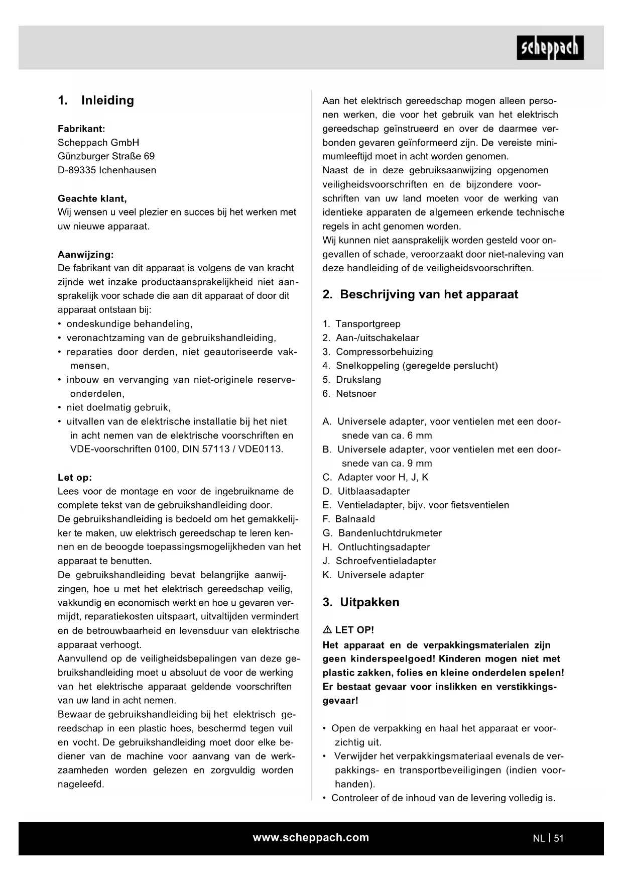 Fabrikant: Scheppach GmbH Günzburger Straße 69 D-89335 Ichenhausen Geachte klant, Wij wensen u veel plezier en succes bij het werken met uw nieuwe apparaat. Aanwijzing: De fabrikant van dit apparaat is volgens de van kracht zijnde wet inzake productaansprakelijkheid niet aan- sprakelijk voor schade die aan dit apparaat of door dit apparaat ontstaan bij: