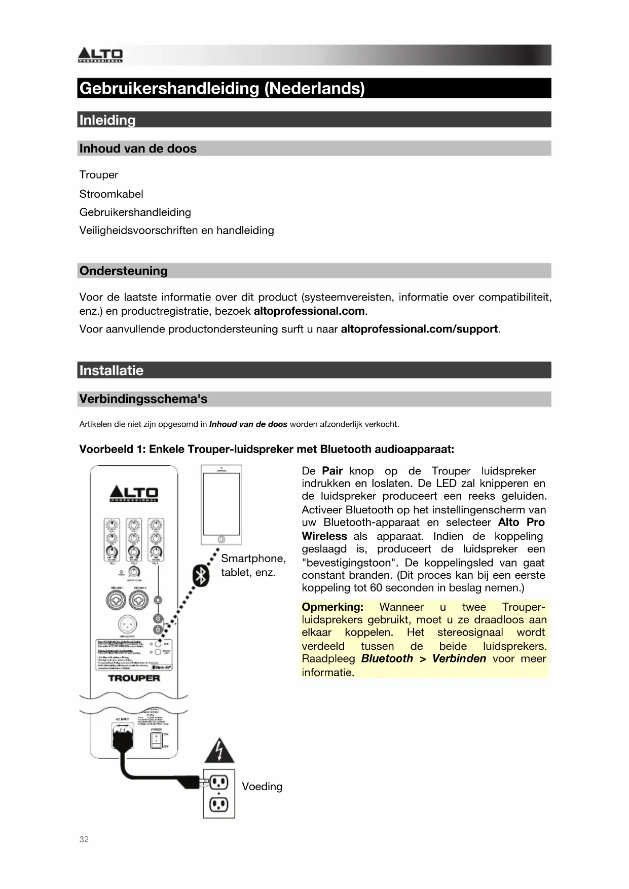 Smartphone, tablet, enz. De Pair knop op de Trouper luidspreker indrukken en loslaten. De LED zal knipperen en de luidspreker produceert een reeks geluiden. Activeer Bluetooth op het instellingenscherm van uw Bluetooth-apparaat en selecteer Alto Pro Wireless als apparaat. Indien de koppeling geslaagd is, produceert de luidspreker een "bevestigingstoon". De koppelingsled van gaat constant branden. (Dit proces kan bij een eerste koppeling tot 60 seconden in beslag nemen.) Opmerking: Wanneer u twee Trouper- luidsprekers gebruikt, moet u ze draadloos aan elkaar koppelen. Het stereosignaal wordt verdeeld tussen de beide luidsprekers. Raadpleeg Bluetooth > Verbinden voor meer informatie. Voeding33