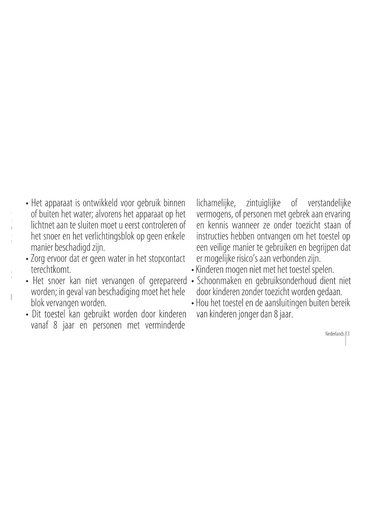 Het apparaat is ontwikkeld voor gebruik binnen of buiten het water; alvorens het apparaat op het Lichtnet aan te sluiten要去 u eerst controlleden of het snoer en het verlichtingsblok op geen enkele manier beschadigd�n.