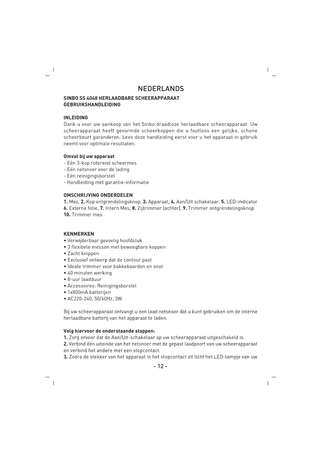 GEBRUIKSHANDLEIDING INLEIDING Dank u voor uw aankoop van het Sinbo draadloze herlaadbare scheerapparaat. Uw scheerapparaat heeft gevormde scheerkoppen die u foutloos een gelijke, schone scheerbeurt garanderen. Lees deze handleiding eerst voor u het apparaat in gebruik neemt voor optimale resultaten. Omvat bij uw apparaat - Eén 3-kop roterend scheermes - Eén netsnoer voor de lading - Eén reinigingsborstel - Handleiding met garantie-informatie OMSCHRIJVING ONDERDELEN