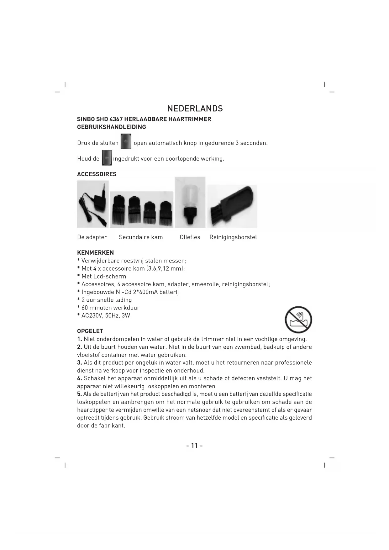 GEBRUIKSHANDLEIDING Druk de sluiten open automatisch knop in gedurende 3 seconden. Houd de ingedrukt voor een doorlopende werking. ACCESSOIRES De adapter Secundaire kam Oliefles Reinigingsborstel KENMERKEN