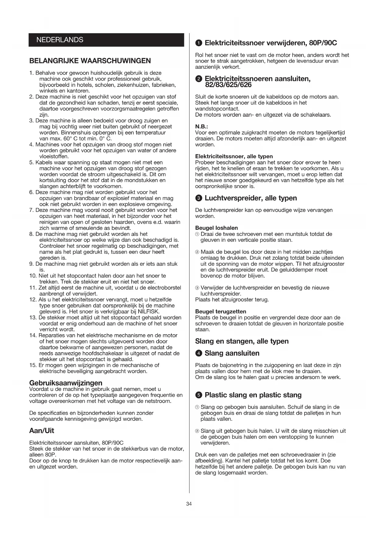 elektrische beveiliging aangebracht worden. Gebruiksaanwijzingen Voordat u de machine in gebruik gaat nemen, moet u controleren of de op het typeplaatje aangegeven frequentie en voltage overeenkomen met het voltage van de netstroom. De specificaties en bijzonderheden kunnen zonder voorafgaande kennisgeving gewijzigd worden. Aan/Uit Elektriciteitssnoer aansluiten, 80P/90C Steek de stekker van het snoer in de stekkerbus van de motor, alleen 80P. Door op de knop te drukken kan de motor respectievelijk aan- en uitgezet worden. Q Elektriciteitssnoer verwijderen, 80P/90C Rol het snoer niet te vast om de motor heen, anders wordt het snoer te strak aangetrokken, hetgeen de levensduur ervan aanzienlijk verkort. W Elektriciteitssnoeren aansluiten, 82/83/625/626 Sluit de korte snoeren uit de kabeldoos op de motors aan. Steek het lange snoer uit de kabeldoos in het wandstopcontact. De motors worden aan- en uitgezet via de schakelaars. N.B.: Voor een optimale zuigkracht moeten de motors tegelijkertijd draaien. De motors moeten altijd afzonderlijk aan- en uitgezet worden. Elektriciteitssnoer, alle typen Probeer beschadigingen aan het snoer door erover te heen rijden, het te knellen of eraan te trekken te voorkomen. Als u het elektriciteitssnoer wilt vervangen, moet u erop letten dat het nieuwe snoer goedgekeurd en van hetzelfde type als het oorspronkelijke snoer is. E Luchtverspreider, alle typen De luchtverspreider kan op eenvoudige wijze vervangen worden. Beugel loshalen ! Draai de twee schroeven met een muntstuk totdat de gleuven in een verticale positie staan. @ Maak de beugel los door deze in het midden zachtjes omlaag te drukken. Druk net zolang totdat beide uiteinden uit de sponning van de motor wippen. Til het afzuigrooster en de luchtverspreider eruit. De geluiddemper moet bovenop de motor blijven. # Verwijder de luchtverspreider en bevestig de nieuwe luchtverspreider. Plaats het afzuigrooster terug. Beugel terugzetten Plaats de beugel in positie en vergrendel deze door aan de schroeven te draaien totdat de gleuven in horizontale positie staan. Slang en stangen, alle typen R Slang aansluiten Plaats de bajonetring in the zuigopening en laat deze in zijn plaats vallen door hem met de klok mee te draaien. Om de slang los te halen gaat u precies andersom te werk. T Plastic slang en plastic stang ! Slang op gebogen buis aansluiten. Schuif de slang in de gebogen buis en draai de slang totdat de palletjes in hun plaats vallen. @ Slang uit gebogen buis halen. U wilt de slang misschien uit de gebogen buis halen om een verstopping te kunnen verwijderen. Druk een van de palletjes met een schroevedraaier in (zie afbeelding). Kantel het palletje totdat het los komt. Doe hetzelfde bij het andere palletje. De gebogen buis kan nu van de slang losgemaakt worden.35 Y Zuigkrachtregeling op kromme plastic stang ! De zuigkracht van het mondstuk kan geregeld worden via de schuifklep op de gebogen buis. De zuigkracht is optimaal als u de opening sluit door de klep vooruit te schuiven. @ Voor het zuigen van losse kleedjes, gordijnen, enz. kunt u de zuigkracht lager zetten door de klep terug te schuiven. U Rubber of plastic slang en kromme stalen stang Als de slang of de gebogen buis verstopt is, kan de gebogen buis van de slang losgemaakt worden om de verstopping te verwijderen. Loszetten Pak de ring die zich het dichtst bij de gebogen buis bevindt vast en schuif deze op de staaf terug door er tegelijkertijd aan te trekken en te draaien. Vastzetten Met een rubber fitting werkt u gemakkelijker en zal de slang langer meegaan. (Als de fitting te strak gaat zitten, moet u deze losmaken en er aan de binnenkant een ruime hoeveelheid speksteenpoeder of talkpoeder in strooien). ! Plaats de rubber fitting op een rechte ondergrond en duw ÈÈn ring over de rand heen totdat deze in de groef van de gummi koppeling valt. @ Duw de gebogen buis zo ver mogelijk door het verbindingsstuk heen. # Houd de gebogen buis met uw linker hand dicht tegen de gummi koppeling aan en duw de kogelmof van de slang er zo ver mogelijk in. $ Draai of duw de tweede ring in de juiste positie in de groef van de rubber fitting. % Trek in richting van de pijlen; de slang zit nu weer vast. I De Ø50mm stangen bevestigen, 82/83/625/626 ! Voordat de stangen en het mondstuk bevestigd kunnen worden, moet de bajonetring tegen de klok in losgedraaid worden. @ Vervolgens worden de stang en het mondstuk bevestigd; de bajonetring wordt met de klok mee vastgedraaid totdat deze in zijn plaats valt. Hulpstukken NILFISK heeft een groot assortiment stangen en mondstukken voor gewone zuigwerkzaamheden, voor het zuigen op hoge plekken en voor bepaalde soorten schoonmaakwerkzaamheden. Zie onze speciale accessoires brochures. O Filter uitschudden, alleen 80P De stofzuiger kan ook zonder de stofzak gebruikt worden. In dat geval wordt het stof opgevangen in het onderste gedeelte van de stofbak, die geleegd wordt wanneer dat nodig is. Om de zuigkracht constant te houden moet de filter zo schoon mogelijk worden gehouden door deze regelmatig uit te schudden of te stofzuigen. De filter mag niet gewassen of afgeborsteld worden. Motor verwijderen en vervangen, 80P ! Pak de beugel van de motor vast en open de bovenste sluithaken. Til de motor eruit. @ Trek de filter er aan het blauwe onderstuk uit en schud deze voorzichtig heen en weer. De slang moet tijdens het uitschudden aan de stofbak vast blijven zitten. Als u de nieuwe motor erin zet, moet u erop letten dat de schakelaar zich precies boven de zuigopening van de stofbak bevindt en dat de pen naar achteren staat. Motor verwijderen en vervangen, 90C ! Draai de beugel van de motor tegen de klok in. Til de motor eruit. De filter kan gereinigd worden door deze te stofzuigen. @ Als u de nieuwe motor erin zet, moet de Aan/Uit schakelaar op ÈÈn lijn met de aanduiding voor Aan/Uit schakelaar op het bovenste gedeelte van de stofbak komen te staan. Draai de motor met de klok mee totdat u een klik hoort. Als de motor bij het draaien niet