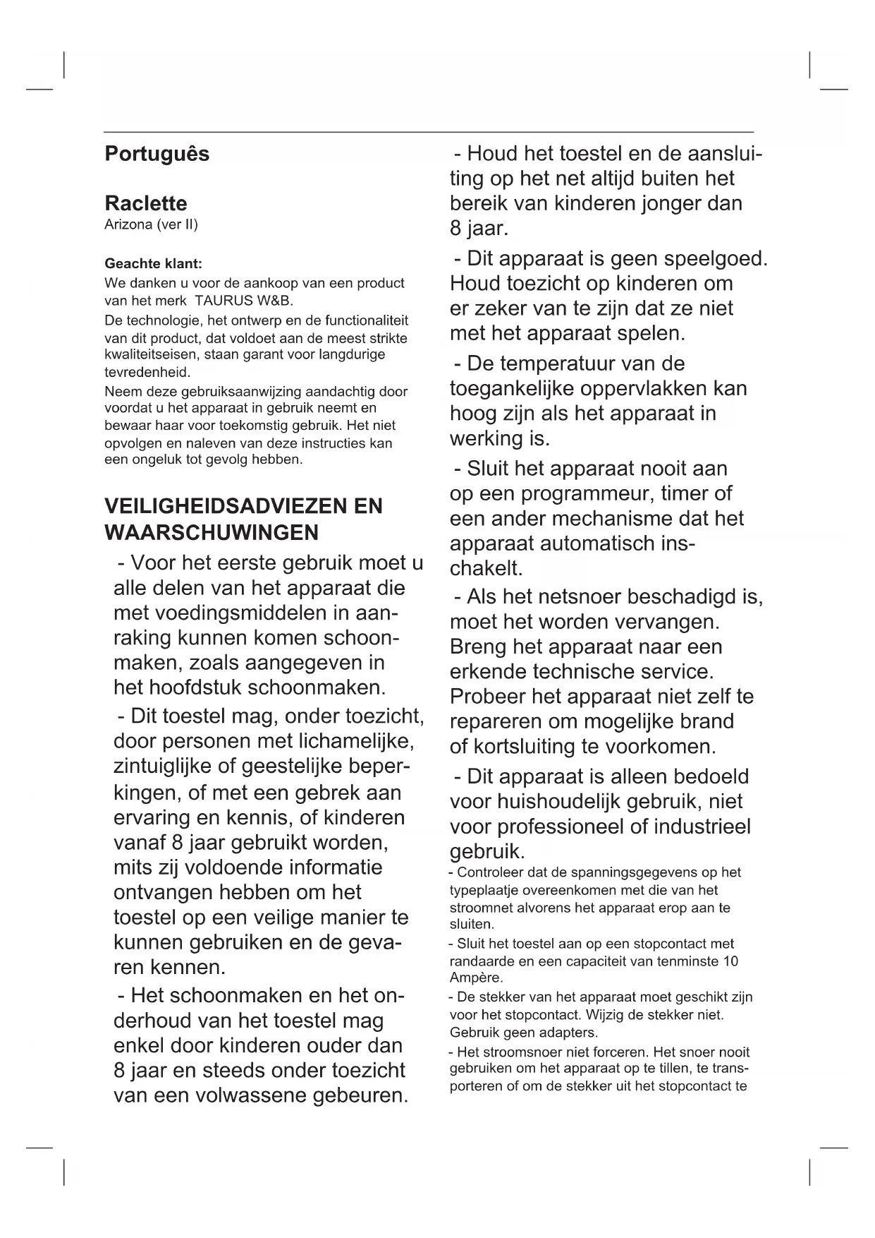 - Os materiais que constituem a embalagem deste aparelho estão integrados num sistema de recolha, classicação e reciclagem. Se desejar eliminá-los, utilize os contentores de reciclagem colocados à disposição para cada tipo de material. - O produto está isento de concentrações de substâncias que possam ser consideradas nocivas para o ambiente. Este símbolo signica que, se desejar desfazer-se do produto depois de terminada a sua vida útil, deve entregá-lo através dos meios adequados ao cuidado de um gestor de resíduos autorizado para a recolha selectiva de Resíduos de Equipamentos Elétricos e Eletróni- cos (REEE). Este aparelho cumpre a Diretiva 2014/35/EC de Baixa Tensão, a Diretiva 2014/30/EC de Com- patibilidade Eletromagnética, a Diretiva 2011/65/ UE sobre restrições à utilização de determinadas substâncias perigosas em aparelhos elétricos e eletrónicos e a Diretiva 2009/125/CE sobre os requisitos de design ecológico aplicável aos produtos relacionados com a energia.Português Raclette Arizona (ver II) Geachte klant: We danken u voor de aankoop van een product van het merk TAURUS W&B. De technologie, het ontwerp en de functionaliteit van dit product, dat voldoet aan de meest strikte kwaliteitseisen, staan garant voor langdurige tevredenheid. Neem deze gebruiksaanwijzing aandachtig door voordat u het apparaat in gebruik neemt en bewaar haar voor toekomstig gebruik. Het niet opvolgen en naleven van deze instructies kan een ongeluk tot gevolg hebben. VEILIGHEIDSADVIEZEN EN WAARSCHUWINGEN - Voor het eerste gebruik moet u alle delen van het apparaat die met voedingsmiddelen in aan- raking kunnen komen schoon- maken, zoals aangegeven in het hoofdstuk schoonmaken. - Dit toestel mag, onder toezicht, door personen met lichamelijke, zintuiglijke of geestelijke beper- kingen, of met een gebrek aan ervaring en kennis, of kinderen vanaf 8 jaar gebruikt worden, mits zij voldoende informatie ontvangen hebben om het toestel op een veilige manier te kunnen gebruiken en de geva- ren kennen. - Het schoonmaken en het on- derhoud van het toestel mag enkel door kinderen ouder dan 8 jaar en steeds onder toezicht van een volwassene gebeuren. - Houd het toestel en de aanslui- ting op het net altijd buiten het bereik van kinderen jonger dan 8 jaar. - Dit apparaat is geen speelgoed. Houd toezicht op kinderen om er zeker van te zijn dat ze niet met het apparaat spelen. - De temperatuur van de toegankelijke oppervlakken kan hoog zijn als het apparaat in werking is. - Sluit het apparaat nooit aan op een programmeur, timer of een ander mechanisme dat het apparaat automatisch ins- chakelt. - Als het netsnoer beschadigd is, moet het worden vervangen. Breng het apparaat naar een erkende technische service. Probeer het apparaat niet zelf te repareren om mogelijke brand of kortsluiting te voorkomen. - Dit apparaat is alleen bedoeld voor huishoudelijk gebruik, niet voor professioneel of industrieel gebruik. - Controleer dat de spanningsgegevens op het typeplaatje overeenkomen met die van het stroomnet alvorens het apparaat erop aan te sluiten. - Sluit het toestel aan op een stopcontact met randaarde en een capaciteit van tenminste 10 Ampère. - De stekker van het apparaat moet geschikt zijn voor het stopcontact. Wijzig de stekker niet. Gebruik geen adapters. - Het stroomsnoer niet forceren. Het snoer nooit gebruiken om het apparaat op te tillen, te trans- porteren of om de stekker uit het stopcontact tetrekken. - Het snoer niet oprollen rond het apparaat. - Zorg ervoor dat het stroomsnoer niet bekneld of geknikt wordt. - Zorg ervoor dat het stroomsnoer niet van de tafel afhangt of in contact komt met de hete oppervlakken van het apparaat. - Controleer de staat van de elektriciteitskabel. Kapotte kabels of kabels die in de war zijn ver- groten het risico van elektrische schokken. - Het wordt aanbevolen een differentiële schake- laar te installeren met een maximale gevoelig- heid van 30mA, als extra beveiliging van de elektrische voeding. Vraag een bevoegde elektricien om advies. - Raak de stekker niet met natte handen aan. - Het apparaat niet gebruiken wanneer het snoer of de stekker beschadigd is. - Als één van de delen van de behuizing van het apparaat kapot gaat, het apparaat onmidde- llijk uitschakelen om elektrische schokken te vermijden. - Gebruik het apparaat niet als het is gevallen, wanneer er zichtbare tekenen van schade zijn of wanneer het lekt. - Dit apparaat is niet geschikt voor gebruik buiten- shuis. - Zorg dat het werkblad schoon en goed verlicht is. Wanordelijke en donkere zones werken ongelukken in de hand. - Plaats het apparaat niet op hete oppervlakken zoals kookplaten, gasbranders, ovens of der- gelijke. - Het apparaat mag niet onder een stopcontact geplaatst worden. - Gebruik het apparaat uitsluitend met het bijgele- verde onderstel. - Plaats het toestel op een horizontaal, vlak en stabiel oppervlak dat bestand is tegen hoge temperaturen, ver verwijderd van andere war- mtebronnen en eventueel spattend water. - Bewaar of gebruik het toestel niet buitenshuis. - Het apparaat niet aan regen of vochtigheid blootstellen. Water dat in het apparaat komt vergroot het risico van een elektrische schok. - Personen die geen warmte voelen moeten het apparaat niet gebruiken (aangezien het appara- at oppervlakken heeft die heet worden). - Raak de verhitte delen van het toestel niet aan, aangezien daardoor ernstige brandwonden kunnen ontstaan. GEBRUIK EN ONDERHOUD: - Rol voor gebruik het netsnoer van het apparaat volledig af. - Gebruik het apparaat niet wanneer de accessoi- res niet correct aangekoppeld zijn. - Gebruik het apparaat niet als de aangekoppel- de accessoires beschadigd zijn. Vervang ze onmiddellijk. - - Het apparaat niet leeg gebruiken, ofwel zonder lading. - Gebruik het apparaat niet als de aan-/uitknop niet werkt. - Verplaats de friteuse niet wanneer ze aanstaat of wanneer de olie nog warm is. Wanneer de friteuse afgekoeld is, kunt u haar verplaatsen door gebruik te mak