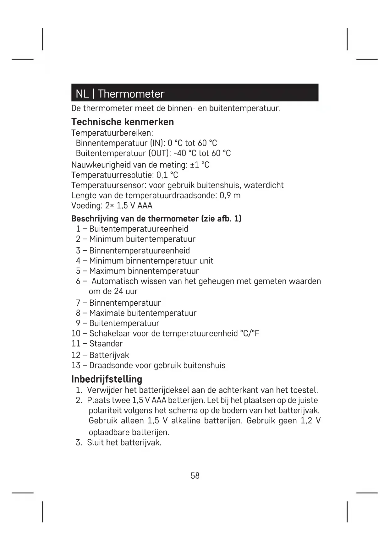 onderste helft van de display in veld 7. Registratie van maximum en minimum temperatuur De thermometer registreert automatisch de maximum- en mini- mumtemperatuur. De waarden voor de buitentemperatuur (OUT) worden weergegeven in velden 2 en 8. De waarden voor de binnentemperatuur (IN) worden weergegeven in velden 4 en 5. Het meetgeheugen wordt automatisch gewist elke 24 uur, vanaf het moment dat de batterijen zijn geplaatst. Voorbeeld: Als u de batterijen om 7:00 uur plaatst, zal het geheugen elke volgende dag om 7:00 uur worden gewist. Wijzigen van de temperatuureenheid °C/°F Verwijder de batterijen uit de thermometer. Schuif de schakelaar op de achterkant van de thermometer in de stand °C of °F. Plaats de batterijen terug in de thermometer. Zorg en onderhoud Het product is ontworpen om bij de juiste zorg jarenlang betrouwbaar te dienen. Hier zijn enkele tips voor een goede bediening: