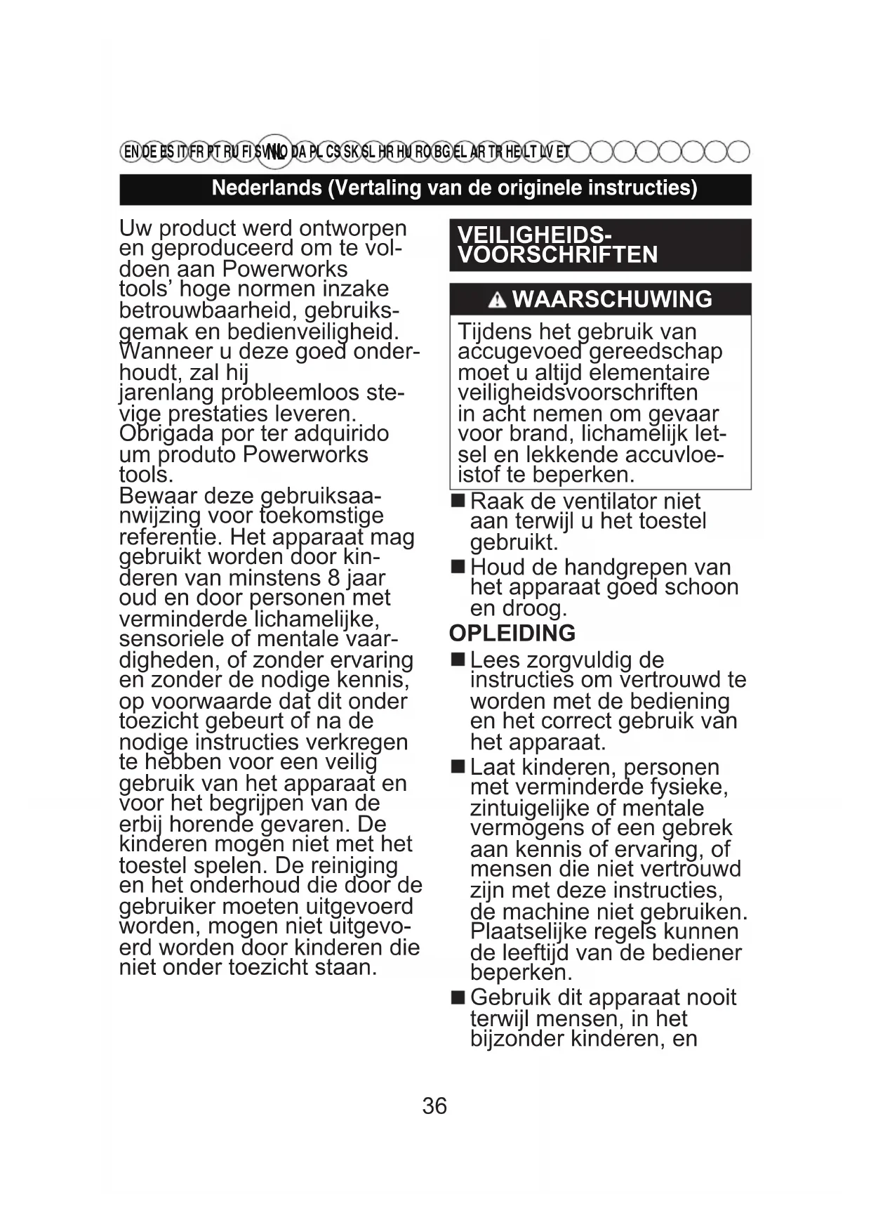 EN DE ES IT FR PT RU FI SV NO DA PL CS SK SL HR HU RO BG EL AR TR HE LT LV ET Uw product werd ontworpen en geproduceerd om te vol- doen aan Powerworks tools’ hoge normen inzake betrouwbaarheid, gebruiks- gemak en bedienveiligheid. Wanneer u deze goed onder- houdt, zal hij jarenlang probleemloos ste- vige prestaties leveren. Obrigada por ter adquirido um produto Powerworks tools. Bewaar deze gebruiksaa- nwijzing voor toekomstige referentie. Het apparaat mag gebruikt worden door kin- deren van minstens 8 jaar oud en door personen met verminderde lichamelijke, sensoriele of mentale vaar- digheden, of zonder ervaring en zonder de nodige kennis, op voorwaarde dat dit onder toezicht gebeurt of na de nodige instructies verkregen te hebben voor een veilig gebruik van het apparaat en voor het begrijpen van de erbij horende gevaren. De kinderen mogen niet met het toestel spelen. De reiniging en het onderhoud die door de gebruiker moeten uitgevoerd worden, mogen niet uitgevo- erd worden door kinderen die niet onder toezicht staan. VEILIGHEIDS- VOORSCHRIFTEN WAARSCHUWING Tijdens het gebruik van accugevoed gereedschap moet u altijd elementaire veiligheidsvoorschriften in acht nemen om gevaar voor brand, lichamelijk let- sel en lekkende accuvloe- istof te beperken. Raak de ventilator niet aan terwijl u het toestel gebruikt. Houd de handgrepen van het apparaat goed schoon en droog. OPLEIDING Lees zorgvuldig de instructies om vertrouwd te worden met de bediening en het correct gebruik van het apparaat. Laat kinderen, personen met verminderde fysieke, zintuigelijke of mentale vermogens of een gebrek aan kennis of ervaring, of mensen die niet vertrouwd zijn met deze instructies, de machine niet gebruiken. Plaatselijke regels kunnen de leeftijd van de bediener beperken. Gebruik dit apparaat nooit terwijl mensen, in het bijzonder kinderen, en 36Nederlands (Vertaling van de originele instructies)
