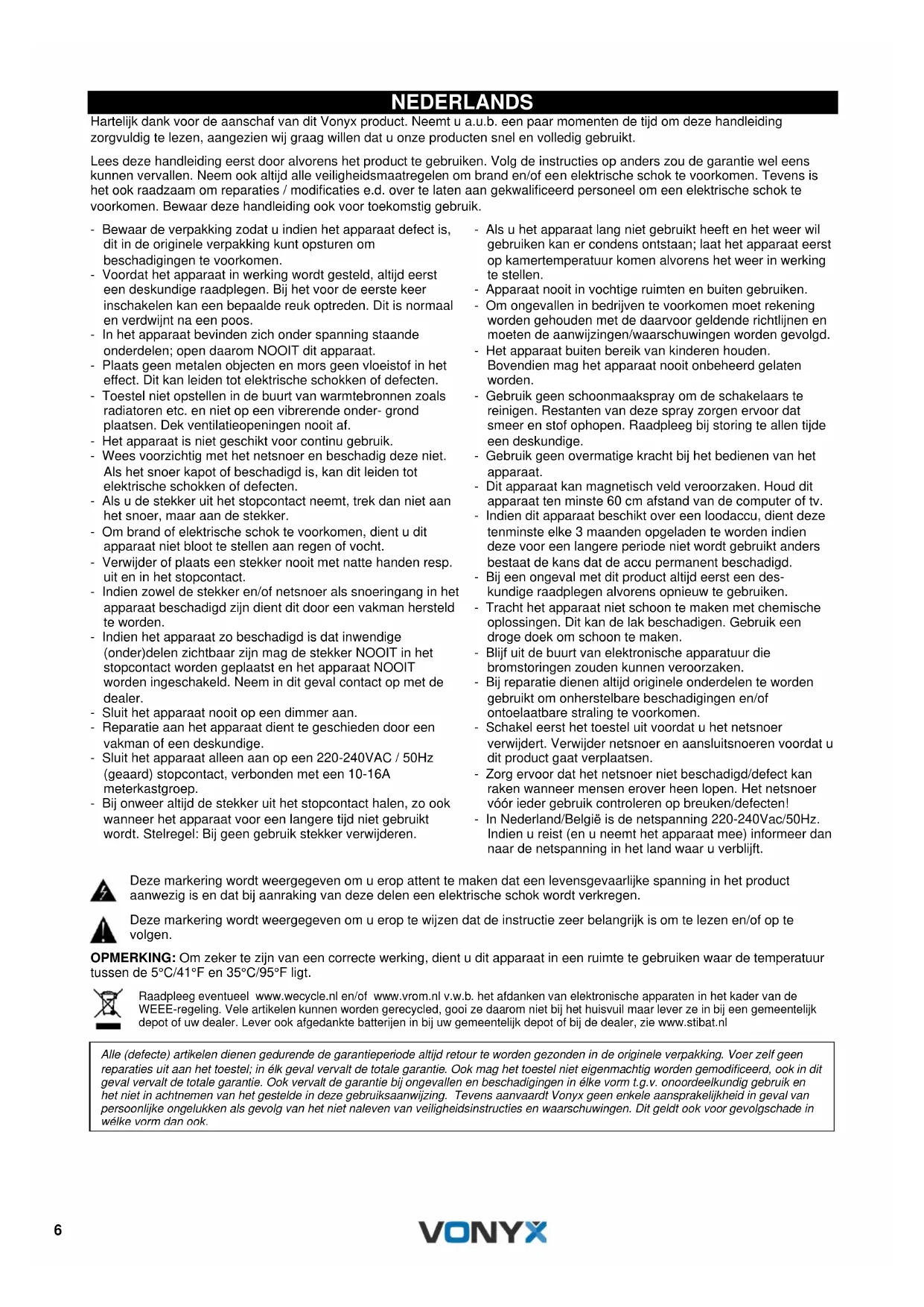 Belgium (BE), Denmark (DK), France (F), Finland (FI), Germany (DE), Hungary (HU), Italy (IT), Netherlands (NL), Norway (NO), Poland (PL), Portugal (PT), Romania (RO), Slovenia (SI), Spain (ES), Sweden (SE), Switzerland (CH), Great Britain (GB).6 NEDERLANDS Hartelijk dank voor de aanschaf van dit Vonyx product. Neemt u a.u.b. een paar momenten de tijd om deze handleiding zorgvuldig te lezen, aangezien wij graag willen dat u onze producten snel en volledig gebruikt. Lees deze handleiding eerst door alvorens het product te gebruiken. Volg de instructies op anders zou de garantie wel eens kunnen vervallen. Neem ook altijd alle veiligheidsmaatregelen om brand en/of een elektrische schok te voorkomen. Tevens is het ook raadzaam om reparaties / modificaties e.d. over te laten aan gekwalificeerd personeel om een elektrische schok te voorkomen. Bewaar deze handleiding ook voor toekomstig gebruik. - Bewaar de verpakking zodat u indien het apparaat defect is, dit in de originele verpakking kunt opsturen om beschadigingen te voorkomen. - Voordat het apparaat in werking wordt gesteld, altijd eerst een deskundige raadplegen. Bij het voor de eerste keer inschakelen kan een bepaalde reuk optreden. Dit is normaal en verdwijnt na een poos. - In het apparaat bevinden zich onder spanning staande onderdelen; open daarom NOOIT dit apparaat. - Plaats geen metalen objecten en mors geen vloeistof in het effect. Dit kan leiden tot elektrische schokken of defecten. - Toestel niet opstellen in de buurt van warmtebronnen zoals radiatoren etc. en niet op een vibrerende onder- grond plaatsen. Dek ventilatieopeningen nooit af. - Het apparaat is niet geschikt voor continu gebruik. - Wees voorzichtig met het netsnoer en beschadig deze niet. Als het snoer kapot of beschadigd is, kan dit leiden tot elektrische schokken of defecten. - Als u de stekker uit het stopcontact neemt, trek dan niet aan het snoer, maar aan de stekker. - Om brand of elektrische schok te voorkomen, dient u dit apparaat niet bloot te stellen aan regen of vocht. - Verwijder of plaats een stekker nooit met natte handen resp. uit en in het stopcontact. - Indien zowel de stekker en/of netsnoer als snoeringang in het apparaat beschadigd zijn dient dit door een vakman hersteld te worden. - Indien het apparaat zo beschadigd is dat inwendige (onder)delen zichtbaar zijn mag de stekker NOOIT in het stopcontact worden geplaatst en het apparaat NOOIT worden ingeschakeld. Neem in dit geval contact op met de dealer. - Sluit het apparaat nooit op een dimmer aan. - Reparatie aan het apparaat dient te geschieden door een vakman of een deskundige. - Sluit het apparaat alleen aan op een 220-240VAC / 50Hz (geaard) stopcontact, verbonden met een 10-16A meterkastgroep. - Bij onweer altijd de stekker uit het stopcontact halen, zo ook wanneer het apparaat voor een langere tijd niet gebruikt wordt. Stelregel: Bij geen gebruik stekker verwijderen. - Als u het apparaat lang niet gebruikt heeft en het weer wil gebruiken kan er condens ontstaan; laat het apparaat eerst op kamertemperatuur komen alvorens het weer in werking te stellen. - Apparaat nooit in vochtige ruimten en buiten gebruiken. - Om ongevallen in bedrijven te voorkomen moet rekening worden gehouden met de daarvoor geldende richtlijnen en moeten de aanwijzingen/waarschuwingen worden gevolgd. - Het apparaat buiten bereik van kinderen houden. Bovendien mag het apparaat nooit onbeheerd gelaten worden. - Gebruik geen schoonmaakspray om de schakelaars te reinigen. Restanten van deze spray zorgen ervoor dat smeer en stof ophopen. Raadpleeg bij storing te allen tijde een deskundige. - Gebruik geen overmatige kracht bij het bedienen van het apparaat. - Dit apparaat kan magnetisch veld veroorzaken. Houd dit apparaat ten minste 60 cm afstand van de computer of tv. - Indien dit apparaat beschikt over een loodaccu, dient deze tenminste elke 3 maanden opgeladen te worden indien deze voor een langere periode niet wordt gebruikt anders bestaat de kans dat de accu permanent beschadigd. - Bij een ongeval met dit product altijd eerst een des- kundige raadplegen alvorens opnieuw te gebruiken. - Tracht het apparaat niet schoon te maken met chemische oplossingen. Dit kan de lak beschadigen. Gebruik een droge doek om schoon te maken. - Blijf uit de buurt van elektronische apparatuur die bromstoringen zouden kunnen veroorzaken. - Bij reparatie dienen altijd originele onderdelen te worden gebruikt om onherstelbare beschadigingen en/of ontoelaatbare straling te voorkomen. - Schakel eerst het toestel uit voordat u het netsnoer verwijdert. Verwijder netsnoer en aansluitsnoeren voordat u dit product gaat verplaatsen. - Zorg ervoor dat het netsnoer niet beschadigd/defect kan raken wanneer mensen erover heen lopen. Het netsnoer vóór ieder gebruik controleren op breuken/defecten! - In Nederland/België is de netspanning 220-240Vac/50Hz. Indien u reist (en u neemt het apparaat mee) informeer dan naar de netspanning in het land waar u verblijft.