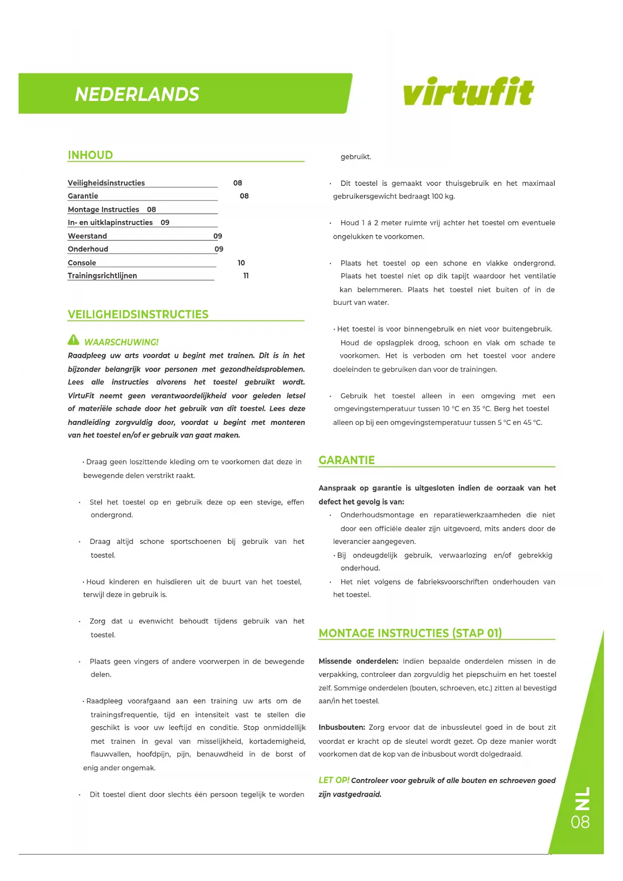 Raadpleeg uw arts voordat u begint met trainen. Dit is in het bijzonder belangrijk voor personen met gezondheidsproblemen. Lees alle instructies alvorens het toestel gebruikt worden. VirtuFit neemt geen verantwoerdelijkheid voor geleden letsel of materiele schade door het gebruik van dit toestel. Lees deze handleiding zorgvuldig door, voordat u begint met monteren van het toestel en/of er gebruik van�akn.