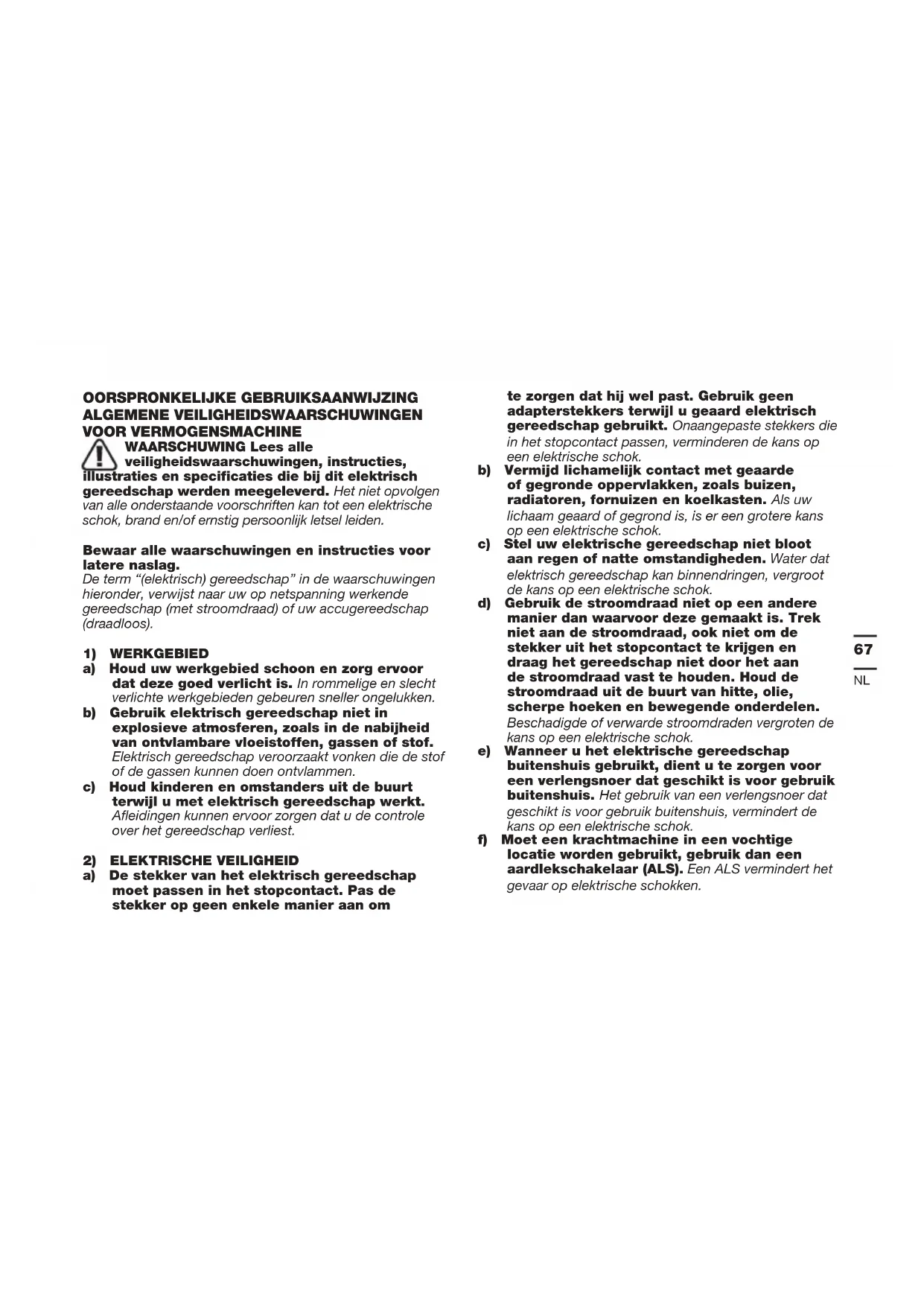 OORSPRONKELIJKE GEBRUIKSAANWIJZING ALGEMENE VEILIGHEIDSWAARSCHUWINGEN VOOR VERMOGENSMACHINE WAARSCHUWING Lees alle veiligheidswaarschuwingen, instructies, illustraties en specificaties die bij dit elektrisch gereedschap werden meegeleverd. Het niet opvolgen van alle onderstaande voorschriften kan tot een elektrische schok, brand en/of ernstig persoonlijk letsel leiden. Bewaar alle waarschuwingen en instructies voor latere naslag. De term “(elektrisch) gereedschap” in de waarschuwingen hieronder, verwijst naar uw op netspanning werkende gereedschap (met stroomdraad) of uw accugereedschap (draadloos).