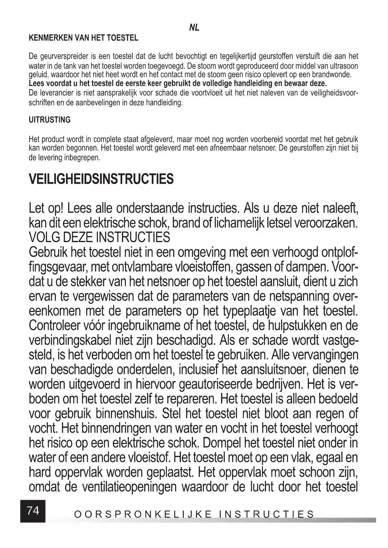 OORSPRONKELIJKE INSTRUCTIES Overbelast de stroomkabel niet. Gebruik de stroomkabel niet om het product te dragen, de stekker aan te sluiten op of los te maken uit het stopcontact. Vermijd contact van de stroomkabel met hitte, olie, scherpe randen en bewegende delen. Schade aan de stroom- kabel verhoogt het risico van een elektrische schok. In geval van schade aan de voedingskabel (bijv. snijden, smelten van isolatie), onmiddellijk de kabelstekker uit het stopcontact trekken en breng het product vervolgens naar een erkend service center. Het is verboden om het toestel met een beschadigde voedingskabel te gebruiken. Het is verboden om de voedingskabel te repareren, de kabel moet worden vervangen door een nieuwe in een erkend service center. Alleen te gebruiken met de meegeleverde voedingseenheid. Andere voedingen zijn niet toegestaan. Het toestel moet tijdens het gebruik te allen tijde onder toezicht worden gehouden. Laat het toestel niet onbeheerd achter als het op de voeding is aangesloten. Het toestel is niet bedoeld voor gebruik door kinderen. Het toestel en de kabel buiten het bereik van kinderen houden. Het is belangrijk om ervoor te zorgen dat kinderen het toestel niet als speelgoed behandelen. Kinderen mogen het toestel niet zonder toezicht schoonmaken of onderhouden. Het toestel is niet bedoeld voor gebruik door personen met verminderde fysieke of mentale vermogens en door personen zonder ervaring en kennis van het toestel, tenzij toezicht of instructie met betrekking tot het gebruik van het toestel op een veilige wordt verzekerd, zodat de risico’s die eraan verbonden zijn worden be- grepen. De watertank mag bij gebruik van het toestel niet worden geopend. Gebruik het toestel niet als het is gevallen, als er zichtbare tekenen van schade zijn of als het lekt. Het is belangrijk om te weten dat een hoge luchtvochtigheid de groei van biologische organismen in het milieu kan bevorderen. Laat het gebied rond de luchtbevochti- ger niet nat of vochtig zijn. Als er vocht optreedt, zet dan de luchtbe- vochtiger uit. Als de luchtbevochtiger niet kan worden uitgeschakeld,77