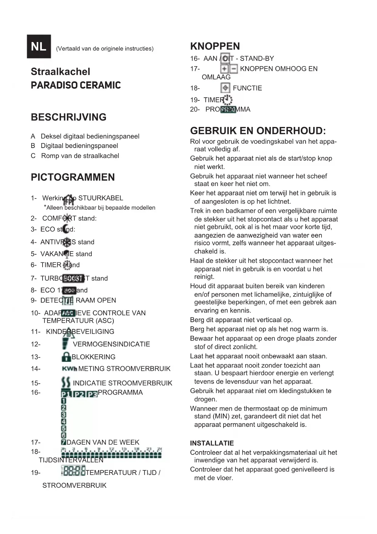 TEMPERATUUR) Druk op de knop om de functie ASC te activeren of deactiveren (ON=activeren; OFF=deactiveren). Druk op de knop om de selectie te bevesti- gen en verder te gaan met de volgende functie: KINDERBEVEILIGING Druk op de knop om de kinderbeveiliging te activeren of deactiveren (ON=activeren; OFF=deactiveren).Druk op de knop om de selectie te bevesti- gen. Wanneer u deactiveren heeft geselecteerd (OFF), gaat de straalkachel automatisch in de uit/stand-by stand. Maar wanneer u activeren heeft geselecteerd (ON), kunt u het gewenste vermogenspercentage instellen op een van de volgende waarden: 40% / 50% / 60%. Gebruik de knop om uw keuze te maken. Bevestig het gewenste percentage met de knop . Op deze manier worden alle wijzigingen in de voorgaande functies opgeslagen en keert de straalkachel terug in de stand uit/stand-by . NA GEBRUIK VAN HET APPARAAT: Zet het apparaat uit met de start/stop knop. Trek de stekker uit het stopcontact. Laat de straalkachel afkoelen Reinig het apparaat. THERMISCHE BEVEILIGING: Dit apparaat beschikt over een thermische beveiliging die het apparaat tegen oververhitting beveiligt. Wanneer het apparaat afwisselend aan- en uitschakelt zonder dat dit het gevolg is van de thermostaat, controleer of de luchtinlaat of – uitlaat wordt geblokkeerd of belemmerd door een voorwerp. Wanneer het apparaat vanzelf uitgaat en niet opnieuw aangaat, trek de stekker uit het stopcontact en wacht 15 minuten alvorens de stekker weer in het stopcontact te steken. Indien het apparaat dan nog steeds niet werkt, neem contact op met een erkende technische dienst. REINIGING Trek de stekker uit het stopcontact en laat het apparaat afkoelen alvorens het te reinigen. Maak het apparaat schoon met een vochtige doek met een paar druppels afwasmiddel en droog het daarna goed af. Gebruik geen oplosmiddelen of producten met een zure of basische pH zoals bleekwater, noch schuurmiddelen, om het apparaat schoon te maken. Zorg ervoor dat er geen water of andere vloeistof binnendringt via de ventilatie-openingen, om schade aan de functionele delen in het inwendi- ge van het apparaat te voorkomen. Dompel het apparaat niet onder in water of een andere vloeistof en houd het niet onder de kraan. Indien het apparaat niet goed schoongehouden wordt, kan het oppervlak beschadigd en de levensduur van het apparaat verkort worden, en kan er een gevaarlijke situatie ontstaan. Opmerking: Wanneer u het apparaat laat opwarmen nadat het lange tijd buiten gebruik is geweest of u het alleen als ventilator heeft gebruikt, kan er aanvankelijk enige rook uit het apparaat komen. Dit is niet ernstig en is het gevolg van het verbranden van stof of andere deeltjes op het verwarmingselement. Dit kan voorkomen worden door de binnenkant van het apparaat eerst schoon te maken met een stofzuiger of een persluchtpistool via de gleuven van het apparaat.Grzejnik PARADISO CERAMIC OPIS A Pokrywa sterowanie dotykowego B Sterowanie dotykowe C Korpus główny nadajnika OZNACZENIA