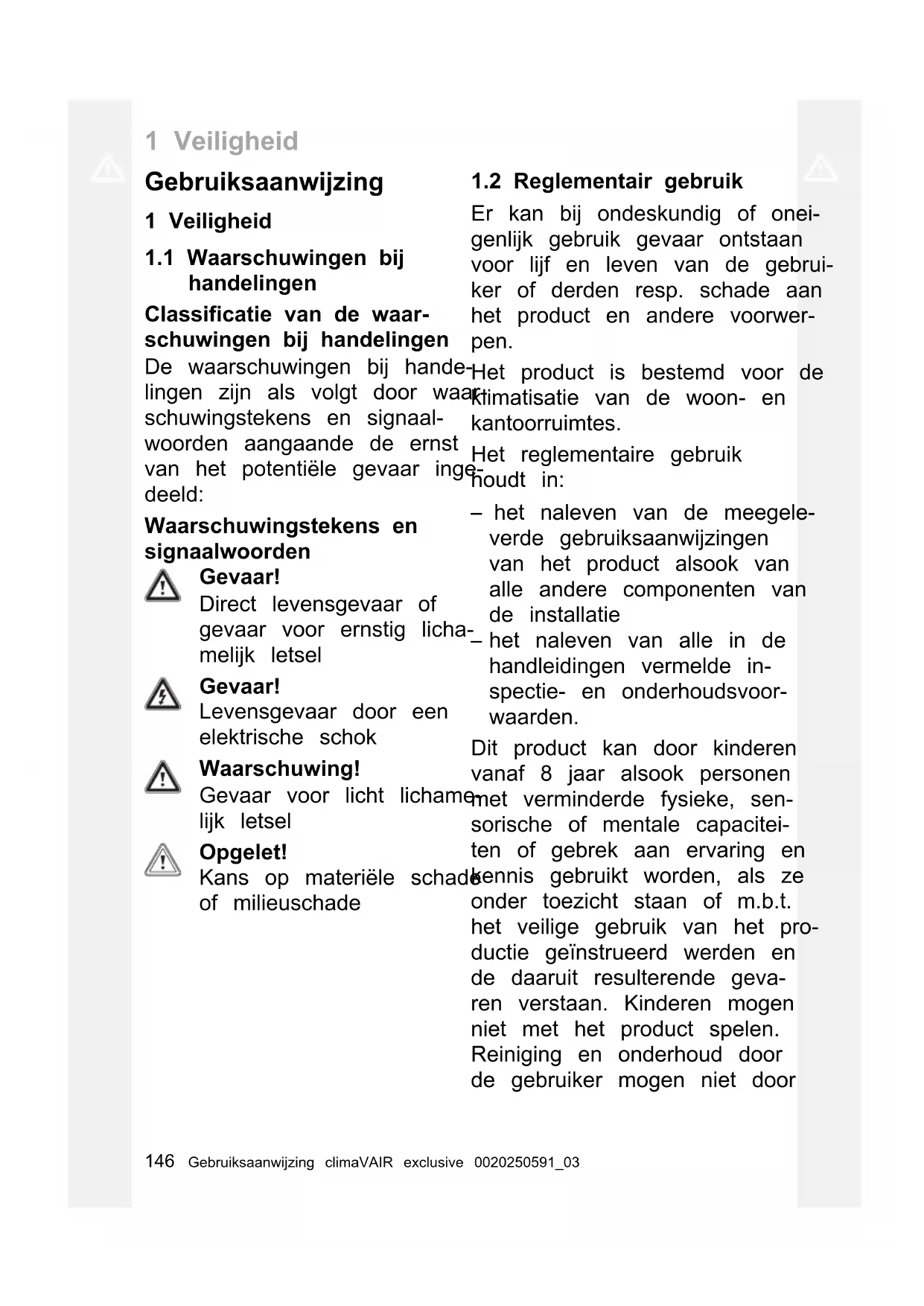 bediening Door foute bediening kunt u zichzelf en anderen in gevaar brengen en materiële schade veroorzaken. ▶ Lees deze handleiding en alle andere documenten die van toepassing zijn zorgvuldig, vooral het hoofdstuk "Veilig- heid" en de waarschuwingen. ▶ Voer alleen de werkzaam- heden uit waarover deze ge- bruiksaanwijzing aanwijzin- gen geeft.1 Veiligheid 148 Gebruiksaanwijzing climaVAIR exclusive 0020250591_03