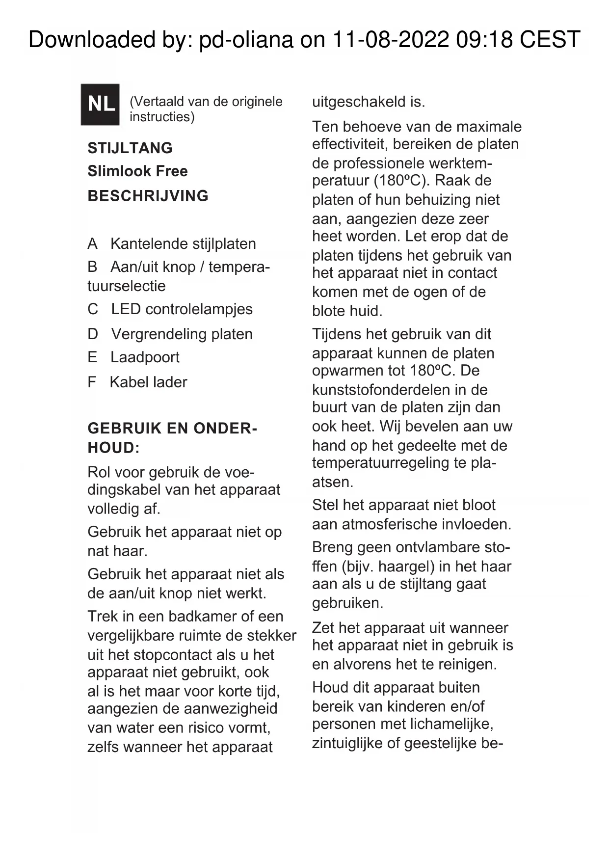 DE STIJLTANG (FIG. 1): Sluit de platen van de stijltang en verschuif de vergrendeling naar de gesloten stand. De platen zijn nu vergrendeld in de gesloten stand. Open de tang door de vergrendeling omgekeerd te verschuiven. De platen zullen opengaan. GEBRUIK: Houd de aan-knop (B) 3 se- conden ingedrukt; de LED controlelampjes(C) van de batterij en de temperatuur zullen knipperen om aan te geven dat de stijltang aan het Downloaded by: pd-oliana on 11-08-2022 09:18 CESTopwarmen is (g. 2). De stan- daardtemperatuur is 150ºC. Druk herhaald op de tempe- ratuurselectie (B) om afwis- selend 150ºC en 180ºC te selecteren. Wanneer de geselecteerde temperatuur bereikt is, blijft het controlelampje van de temperatuur continu branden. De stijltang houdt de geselec- teerde temperatuur constant. Selecteer de voor uw haar geschikte temperatuur. Het wordt aanbevolen een lage temperatuur te gebruiken voor jn, geverfd of bescha- digd haar en hogere tempe- raturen voor krullend, dik en moeilijk hanteerbaar haar. Met deze stijltang kunt u stijl geven aan sluike of gegolfde kapsels. ONTKRULLEN (FIG. 3) Neem een haarlok (van ca. 5 cm breed) en leg deze tussen de platen. Sluit de platen en laat de stijltang langs de hele haarlok glijden, vanaf de wortel naar de punten. Herhaal deze bewerking voor de rest van het haar. Voor een beter resultaat wordt aangeraden met de onderste lagen van het haar te beginnen en daarna de bovenste lagen te doen. VORMGEVEN (FIG. 4) Voor een golvende of ge- krulde , look is een verticale scheiding van de lokken no- dig, zodat de krul natuurlijker valt. De lokken zijn zeer dik voor een grote en natuurlijke gol- vende krul en jner voor een kleine en romantische krul. Draai elke lok op de stijltang met cirkelvormige bewegin- gen (alsof het een ronde borstel was) om krullen of pijpenkrullen te krijgen. Houd het einde van de haar- lok vast en draai het haar terwijl de u stijltang naar beneden laat glijden. AUTOMATISCHE UITS- CHAKELING (STAND-BY): Als het apparaat gedurende 15 minuten niet gebruikt wor- dt, gaat het automatisch uit.