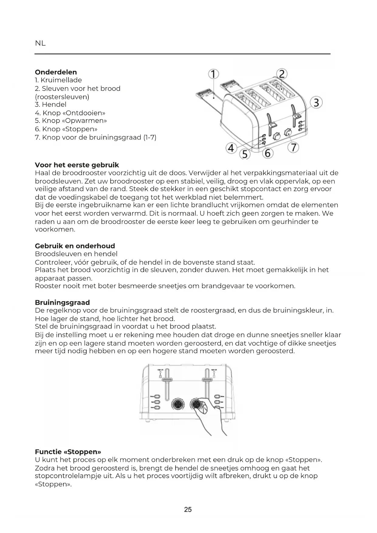 CATEGORIA PRIXTON BIANCA TOASTER HOME Função de elevação alta A função de elevação alta permite utilizar a alavanca para o ajudar a retirar a torrada. Quando o processo de torragem tiver terminado, apenas tem de empurrar a alavanca para cima a partir da sua posição de repouso para levantar a torrada e facilitar a sua extração. Extração de migalhas Para extrair as migalhas, retire a bandeja de recolha de migalhas situada na parte inferior da sua torradeira e esvazie a mesma. Limpe-a e volte a colocá-la. Assegure-se sempre que a sua torradeira arrefeceu completamente e está desligada da alimentação elétrica antes de retirar as migalhas. Nunca utilize a sua torradeira sem que a bandeja de recolha de migalhas esteja corretamente colocada. Limpe sempre que possa a bandeja de recolha de migalhas antes de cada utilização. 24Voor het eerste gebruik Haal de broodrooster voorzichtig uit de doos. Verwijder al het verpakkingsmateriaal uit de broodsleuven. Zet uw broodrooster op een stabiel, veilig, droog en vlak oppervlak, op een veilige afstand van de rand. Steek de stekker in een geschikt stopcontact en zorg ervoor dat de voedingskabel de toegang tot het werkblad niet belemmert. Bij de eerste ingebruikname kan er een lichte brandlucht vrijkomen omdat de elementen voor het eerst worden verwarmd. Dit is normaal. U hoeft zich geen zorgen te maken. We raden u aan om de broodrooster de eerste keer leeg te gebruiken om geurhinder te voorkomen. Gebruik en onderhoud Broodsleuven en hendel Controleer, vóór gebruik, of de hendel in de bovenste stand staat. Plaats het brood voorzichtig in de sleuven, zonder duwen. Het moet gemakkelijk in het apparaat passen. Rooster nooit met boter besmeerde sneetjes om brandgevaar te voorkomen. Bruiningsgraad De regelknop voor de bruiningsgraad stelt de roostergraad, en dus de bruiningskleur, in. Hoe lager de stand, hoe lichter het brood. Stel de bruiningsgraad in voordat u het brood plaatst. Bij de instelling moet u er rekening mee houden dat droge en dunne sneetjes sneller klaar zijn en op een lagere stand moeten worden geroosterd, en dat vochtige of dikke sneetjes meer tijd nodig hebben en op een hogere stand moeten worden geroosterd. Functie «Stoppen» U kunt het proces op elk moment onderbreken met een druk op de knop «Stoppen». Zodra het brood geroosterd is, brengt de hendel de sneetjes omhoog en gaat het stopcontrolelampje uit. Als u het proces voortijdig wilt afbreken, drukt u op de knop «Stoppen».