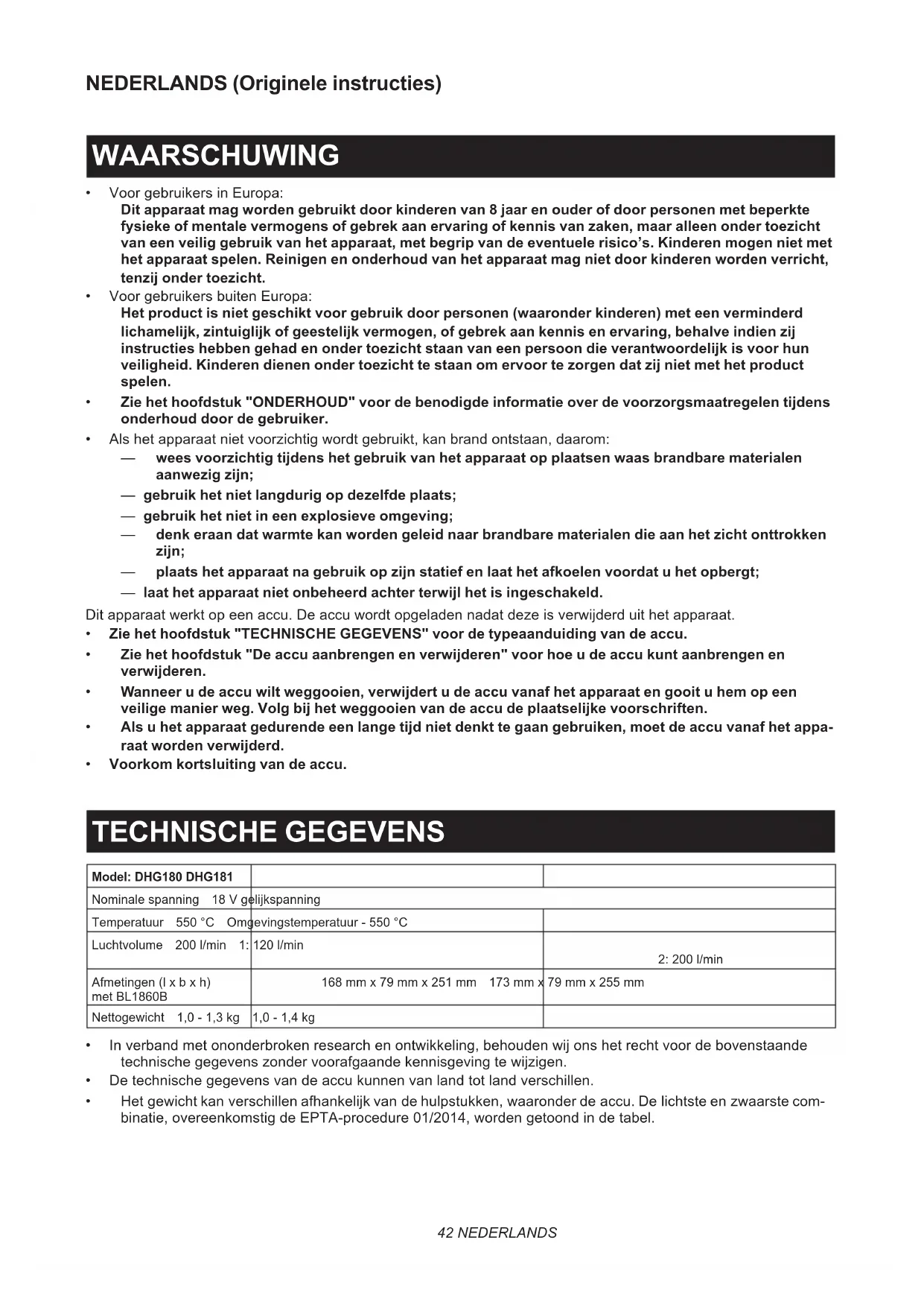 - Voorkom kortsluiting van de accu. TECHNISCHE GEGEVENS Model: DHG180 DHG181 Nominalespanning 18Vgelijkspanning Temperatuur 550°C Omgevingstemperatuur-550°C Luchtvolume 200l/min 1:120l/min 2:200l/min Afmetingen(lxbxh) metBL1860B 168mmx79mmx251mm 173mmx79mmx255mm Nettogewicht 1,0-1,3kg 1,0-1,4kg